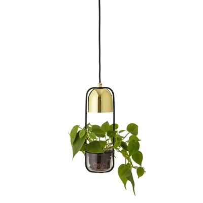 Arany színű függőlámpa kaspóval, amelybe beleilleszthetjük kis zöld cserepes növényünket. Így igazán zöld otthont varázsolhatunk pillanatok alatt. A lámpa arany színe jól illik a zöld növényhez és fénye megvilágítja azt. Ajánljuk beszélgetősarokba, nappaliba. Különösen jól mutat lefelé csüngő növénnyel. A kaspó átmérője 10 cm. A lámpa vezetéke fekete textil, hossza 250 cm. A lámpa magassága 34 cm, átmérője 10 cm. Gyártó: Bloomingville