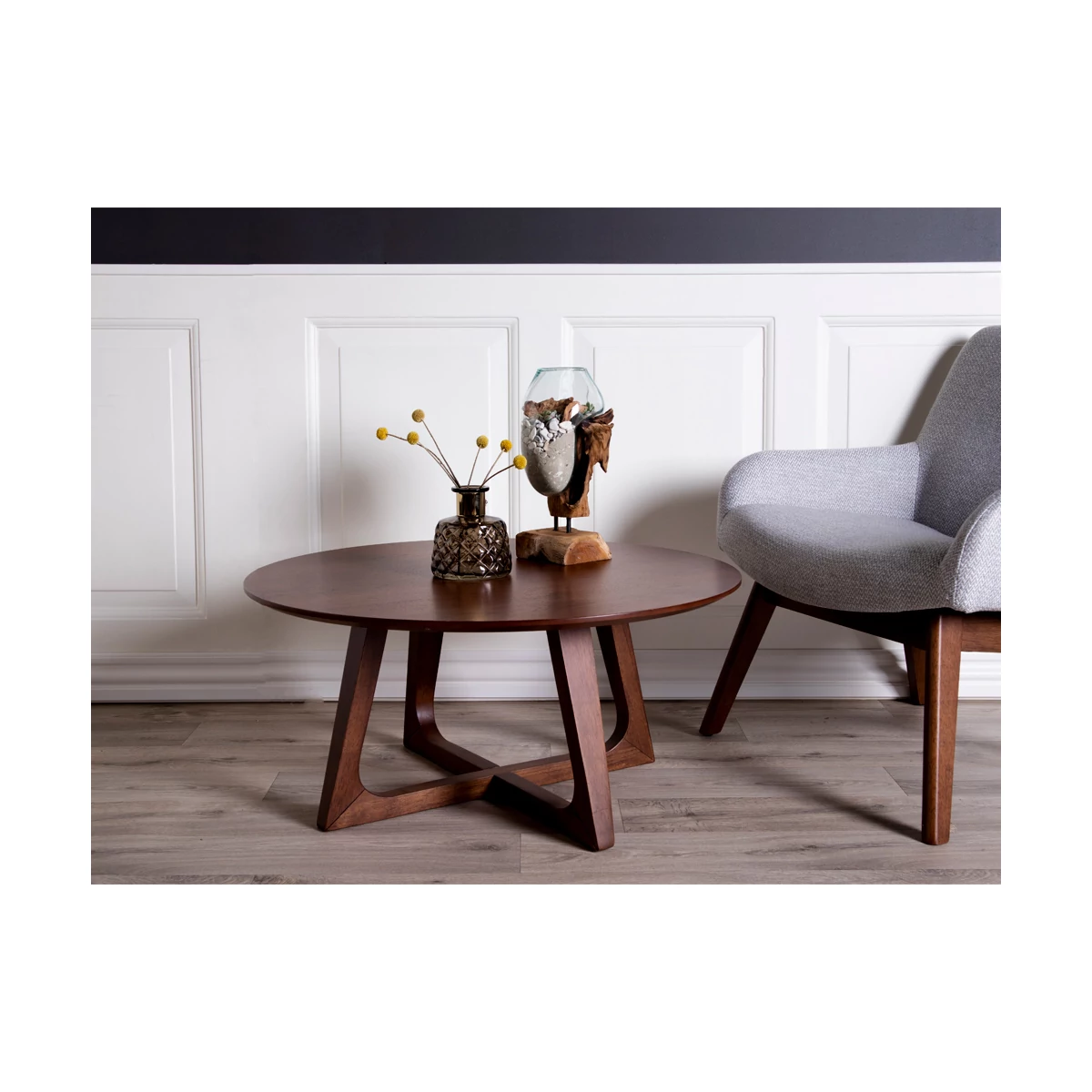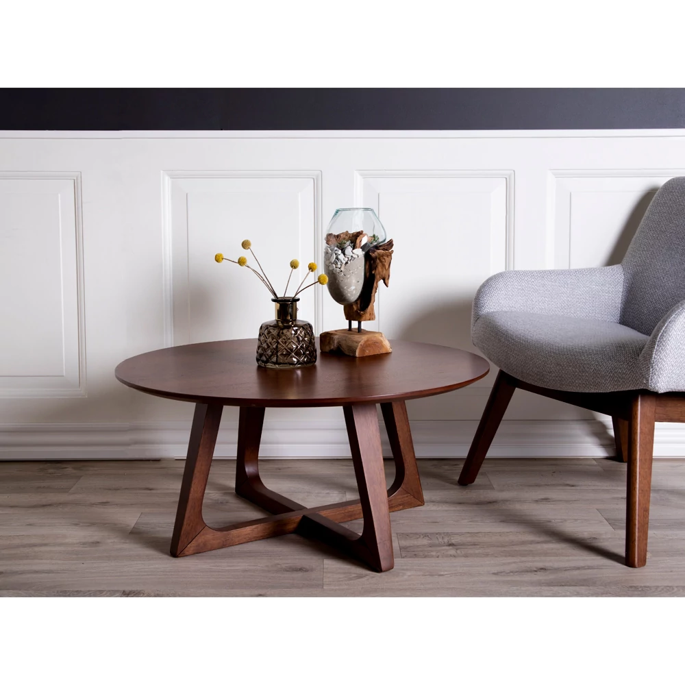 Barna diófa kisasztal. Stílusos dohányzóasztal a nappaliban. Átmérője 75 cm
