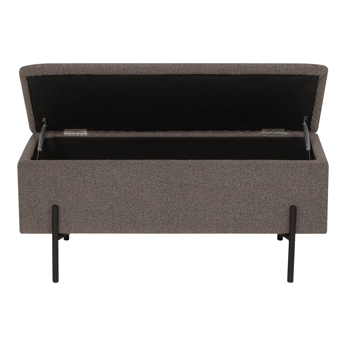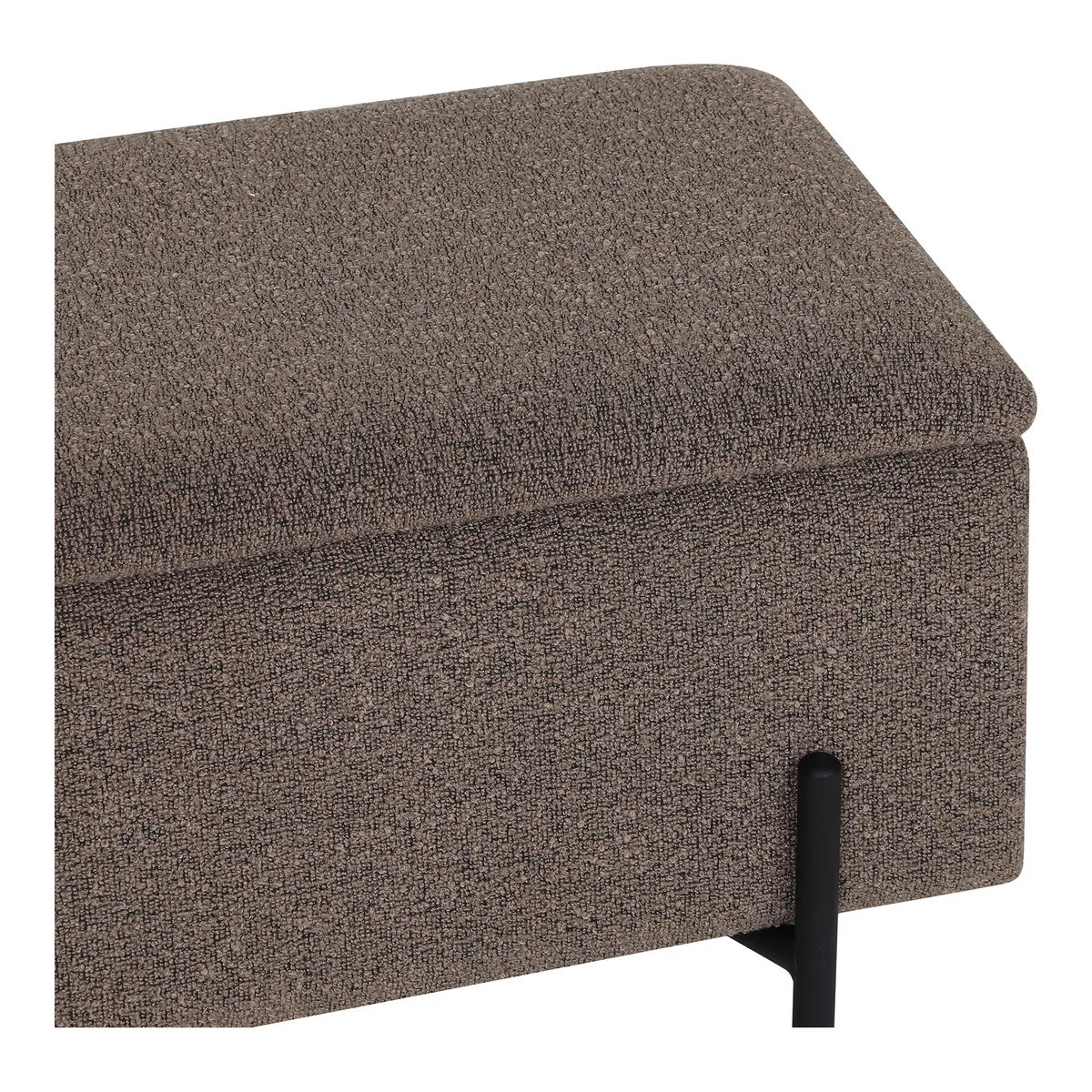 Barna színű tárolós szövet pad, amely modern megjelenésű, igazi nordic hangulatú kiegészítő az előszobában. A pad nagyon praktikus cipőfelvételhez, táskákat lerakni és felnyitható tetejének köszönhetően tágas tárolóhelyet rejt magában. A pad fekete fém lábakon áll, masszív ugyanakkor puha tapintású. Mérete 95x36,5x43 cm. Gyártó: House Nordic