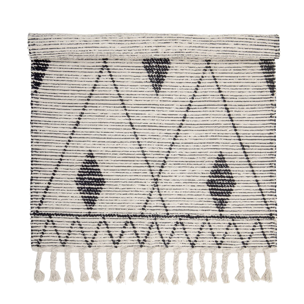 Bohém rombusz mintás pamut szőnyeg, amely fehér alapon fekete rombusz mintás, fiatalos stílusú szőnyeg. A szőnyeg jól illeszkedik a modern enteriőrbe, ugyanakkor vidámmá varázsolja a hangulatot fonott rojtjaival és bohém rombusz mintájával. Ajánljuk a nappali szobába. Mérete 180x120 cm. Gyártó: Creative Collection