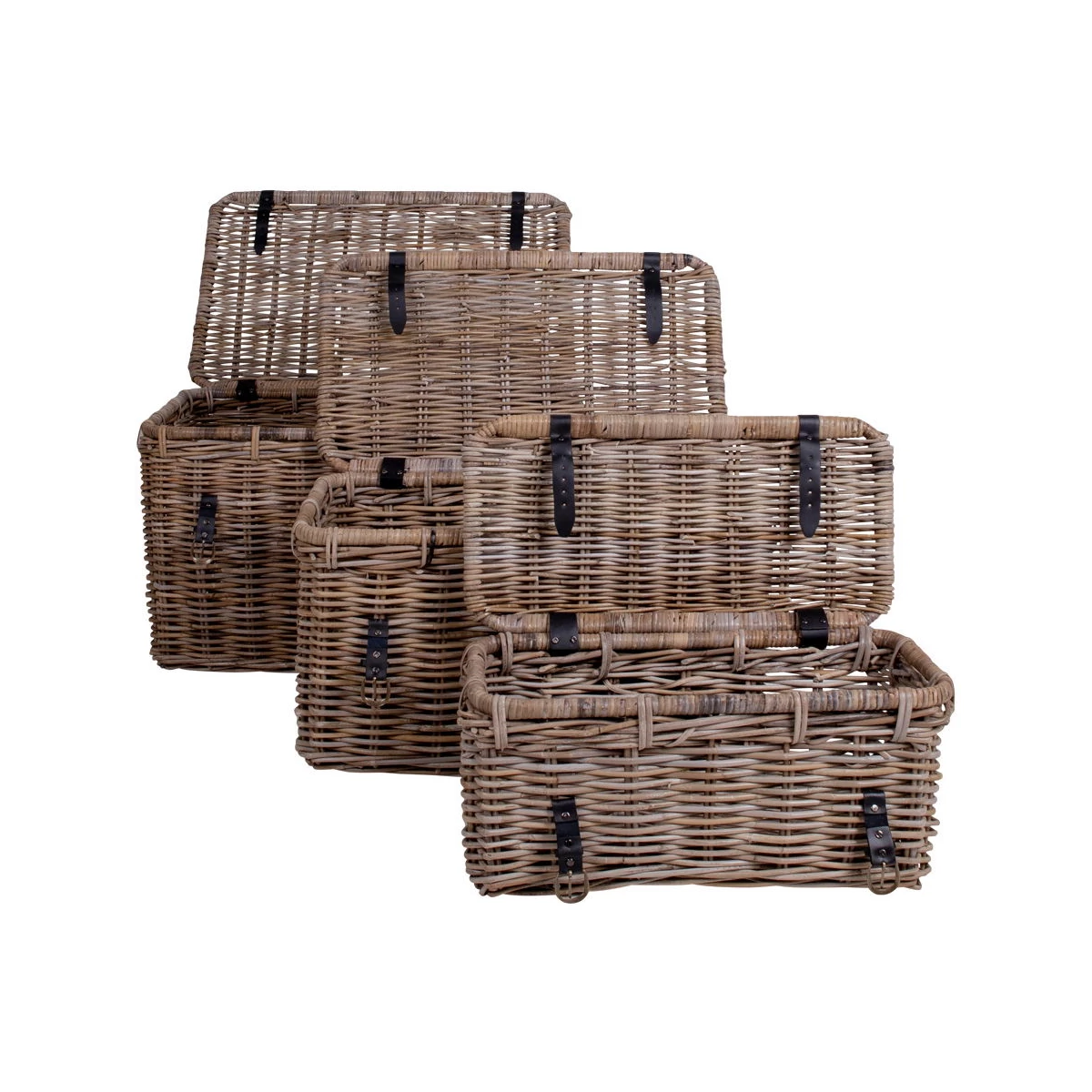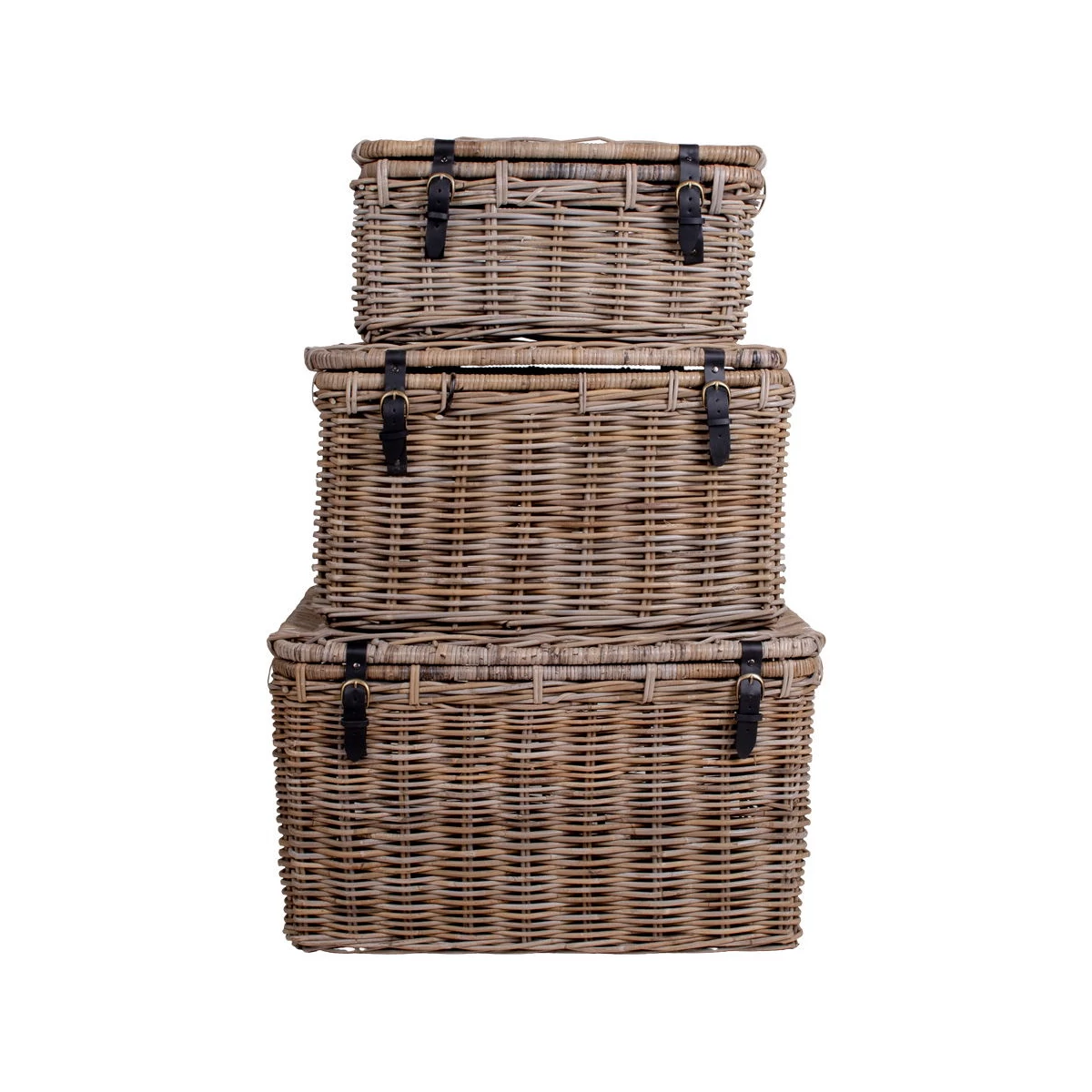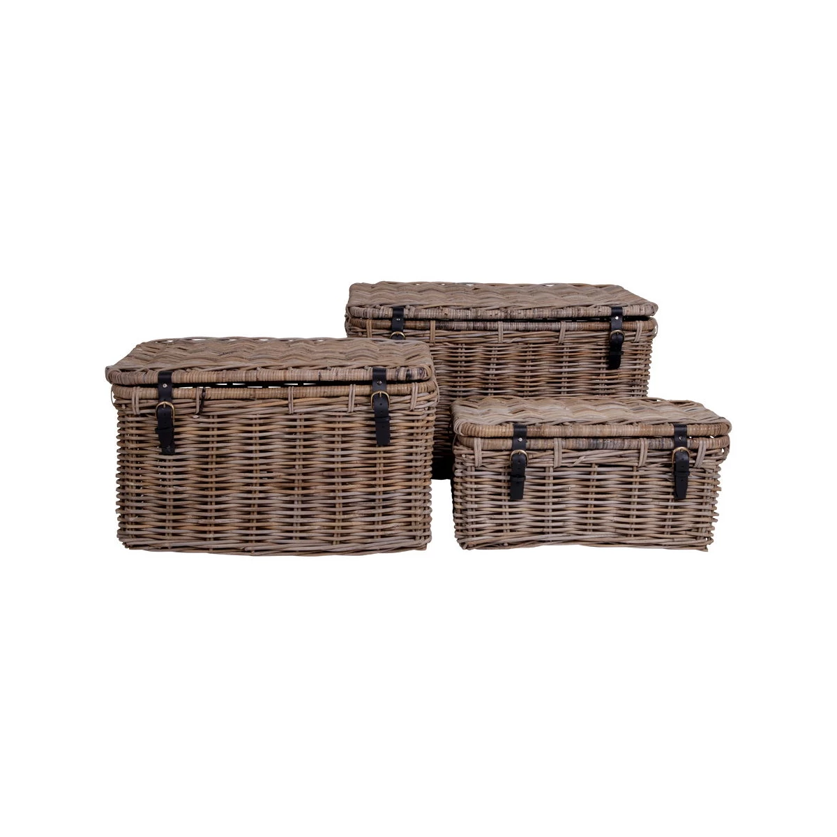 Rattan tárolókosarak bőr szíjjal 3 db-os szett. Extra tárolóhely a teraszodon, tarthatod benne a párnákat, takarókat. Egymásba rakható.