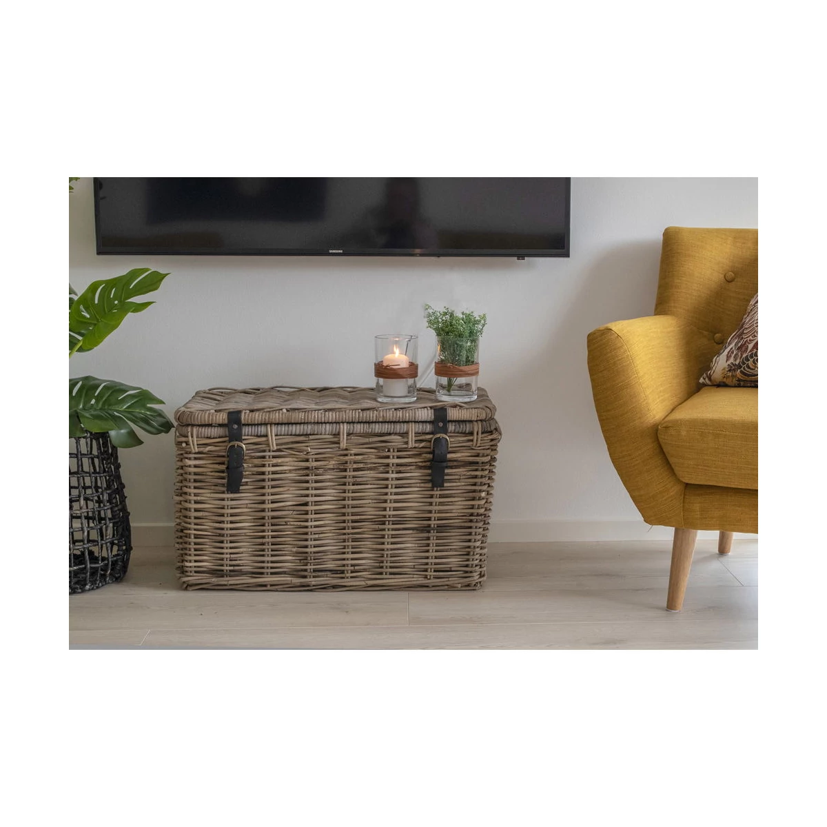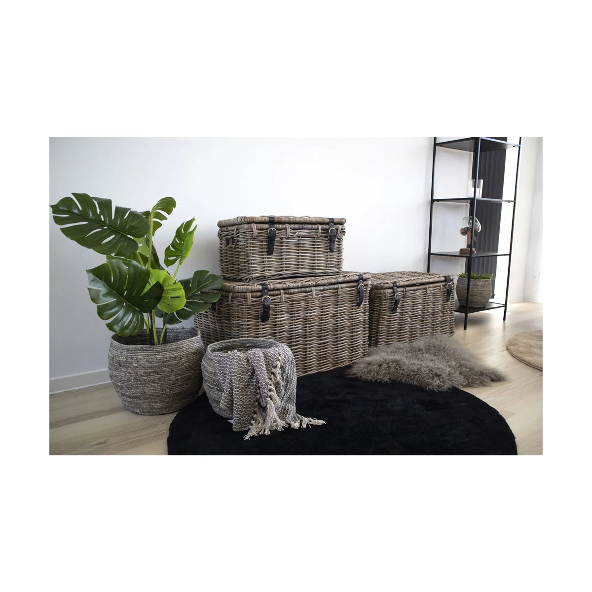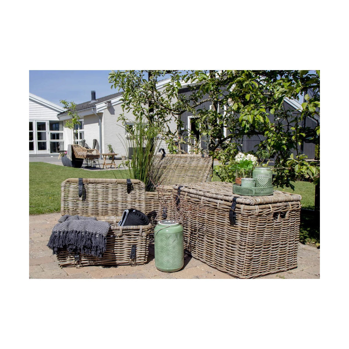 Rattan tárolókosarak bőr szíjjal 3 db-os szett. Extra tárolóhely a teraszodon, tarthatod benne a párnákat, takarókat. Egymásba rakható.