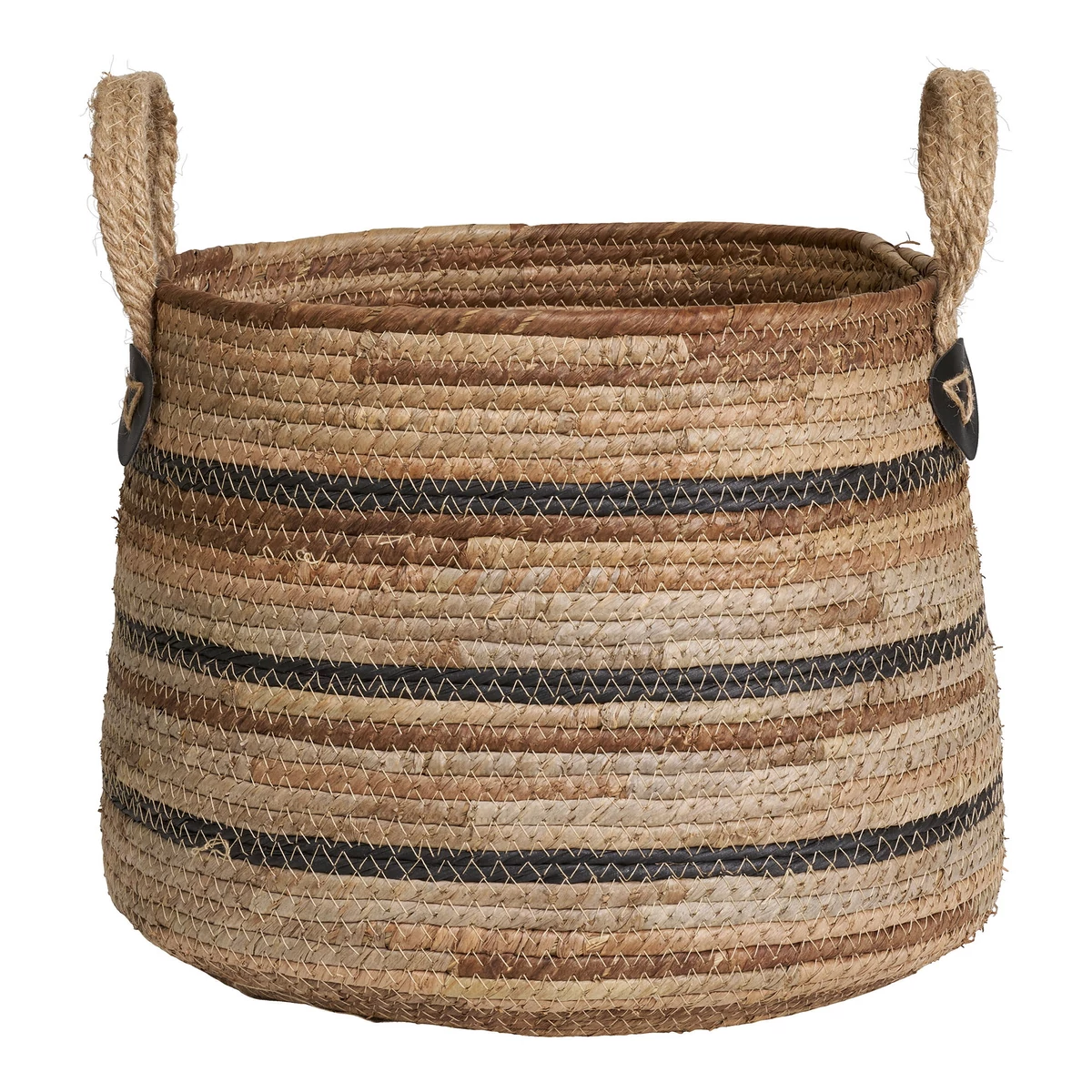 Csíkos banánlevélből fonott füles kosarak 2 db-os szett. Természetes hangulatú sokféleképpen használható kosarak. Méretei ø30,5x22 cm és ø39x29 cm