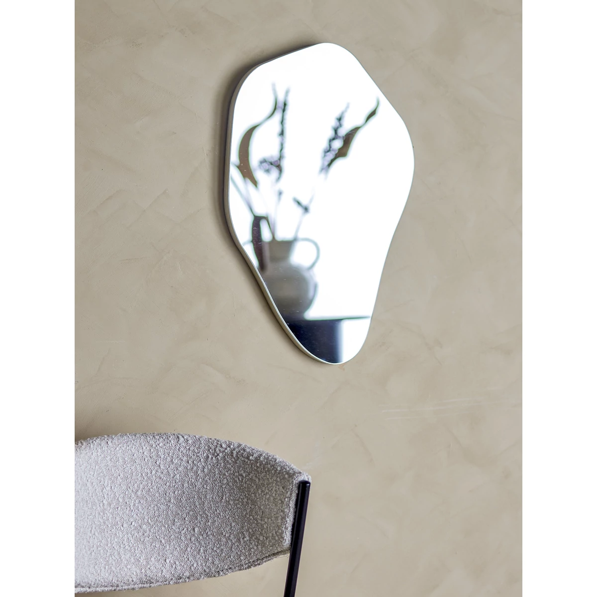 Ezüst szélű, organikus alakú tükör. Modern és feltűnő kiegészítő az otthonodban. Mérete 40x60 cm