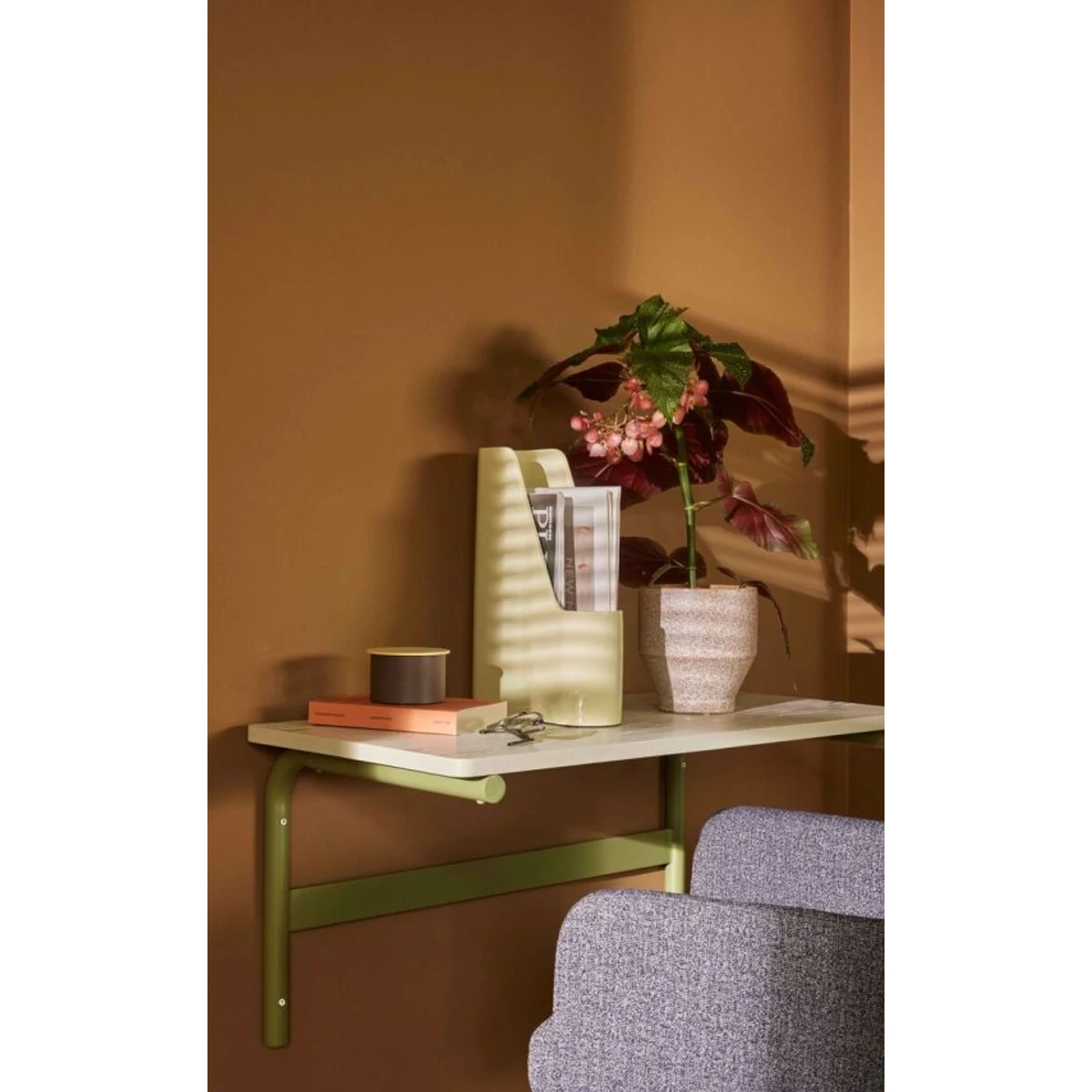 Falra szerelhető íróasztal 80 cm, amely kőrisfa furnérból készült lapból és fém tartóból áll. Ha nincs sok helyed, ez a falra szerelhető íróasztal jó megoldás lehet otthoni munkasaroknak vagy tinédzserszobába íróasztalnak. Az asztal lapja világos szürke, a fém tartószerkezet zöld színű. Mérete 80x40x39 cm Gyártó: Hübsch