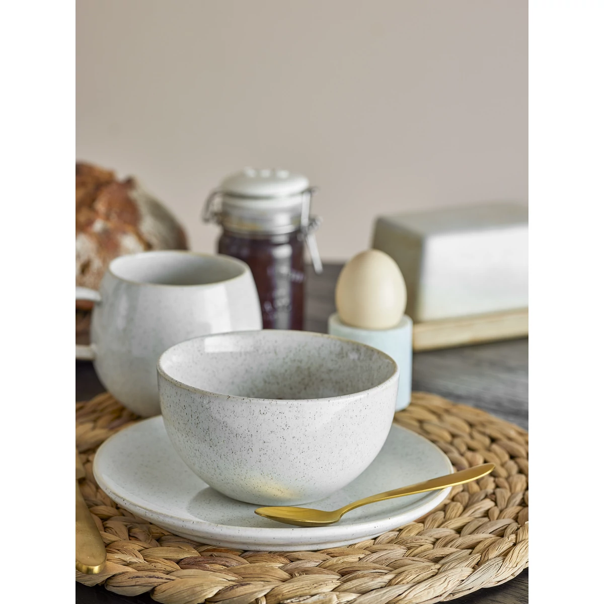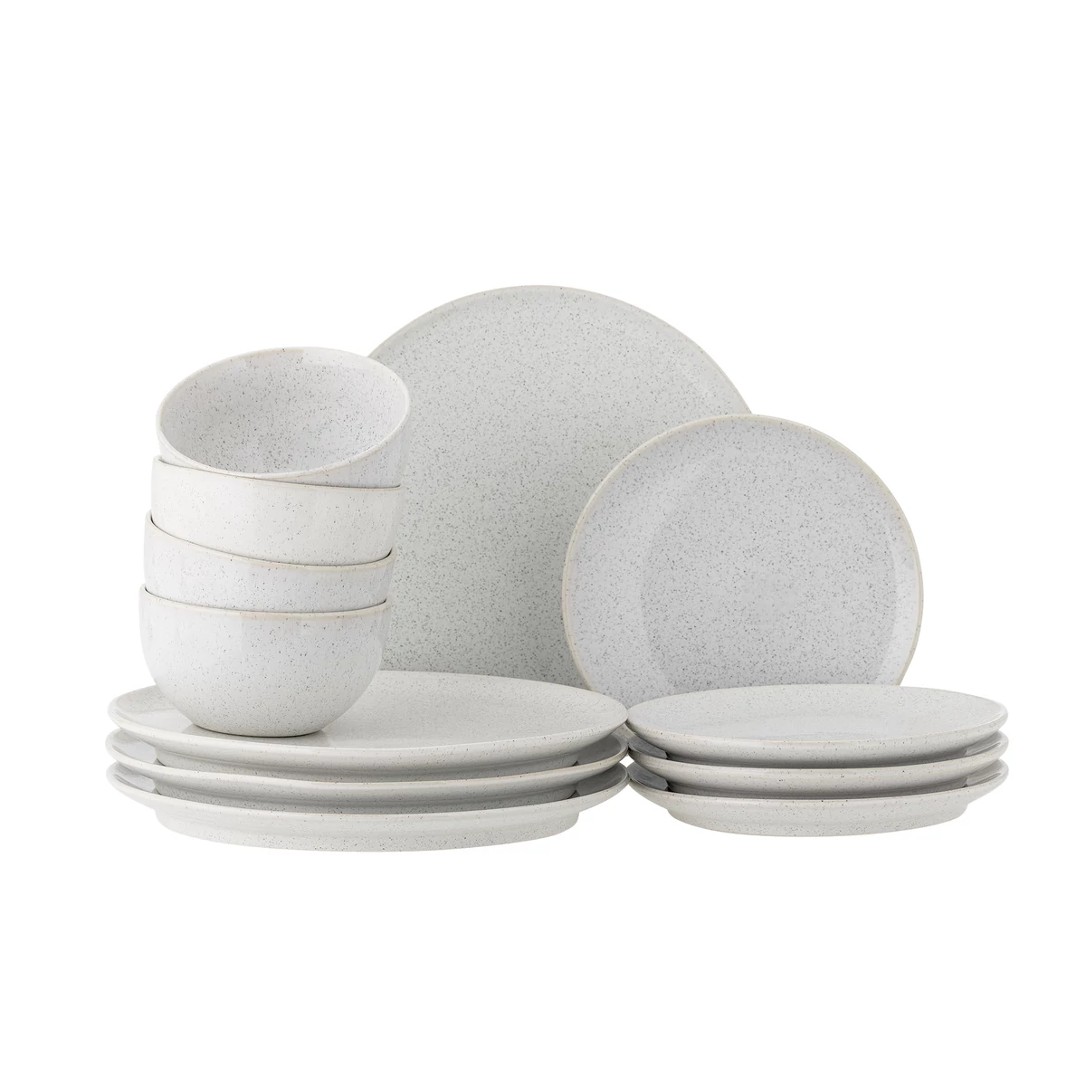 Fehér kerámia 4 személyes étkészlet, amely 4 db nagy lapostányért, 4 db kisebb lapostányért és 4 db tálat tartalmaz. Az étkészlet 100% kerámia, fehér színű, apró szórással, amely modernné, fiatalossá teszi ezt az étkészletet. Mosogatógépben mosható, mikrohullámú sütőben használható. A tányérok átmérője 20 és 26,5, a tál átmérője 13 cm. Gyártó: Bloomingville