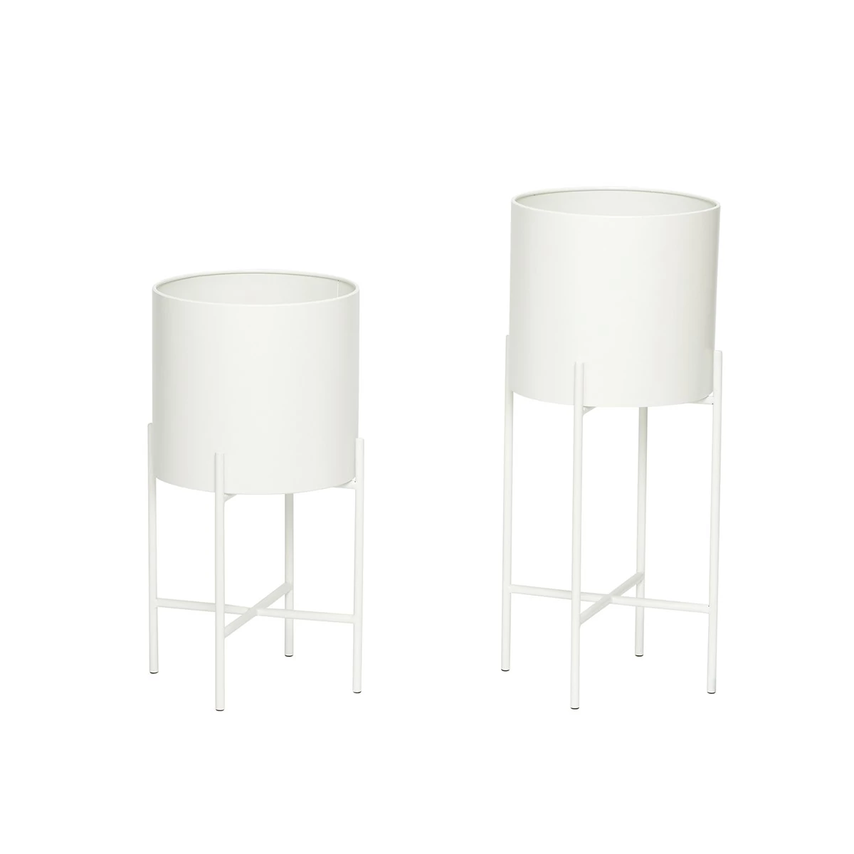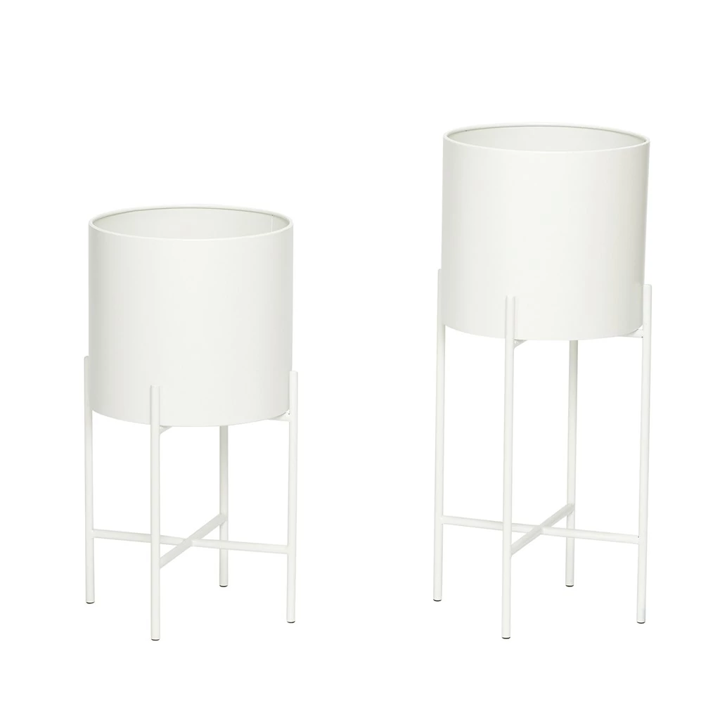 Fehér lábakon álló kaspó szett 2 db, amely valódi skandináv hangulatot teremt otthonodban. A 2 db-os kaspó szett könnyen elhelyezhető a nappali különböző pontjain, a belé helyezett zöld növények mindenképpen hangsúlyosak lesznek a fehér kaspóban. A kaspók anyaga fém, átmérőjük 25 cm, a magasságuk 45 és 55 cm. Gyártó: Hübsch