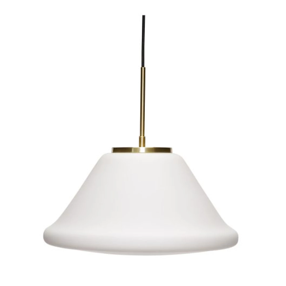 Fehér matt háromszög alakú függőlámpa, amely gyönyörű fehér színével és organikus formájával a skandináv eleganciát csempészi otthonodba. A függőlámpa foglalta aranyszínű sárgaréz, vezetéke fekete textil, a vezeték hossza 250 cm. Ajánljuk nappaliba, étkezőbe vagy hálóba. A függőlámpa magassága 38 cm a búra átmérője 40 cm. Gyártó: Hübsch
