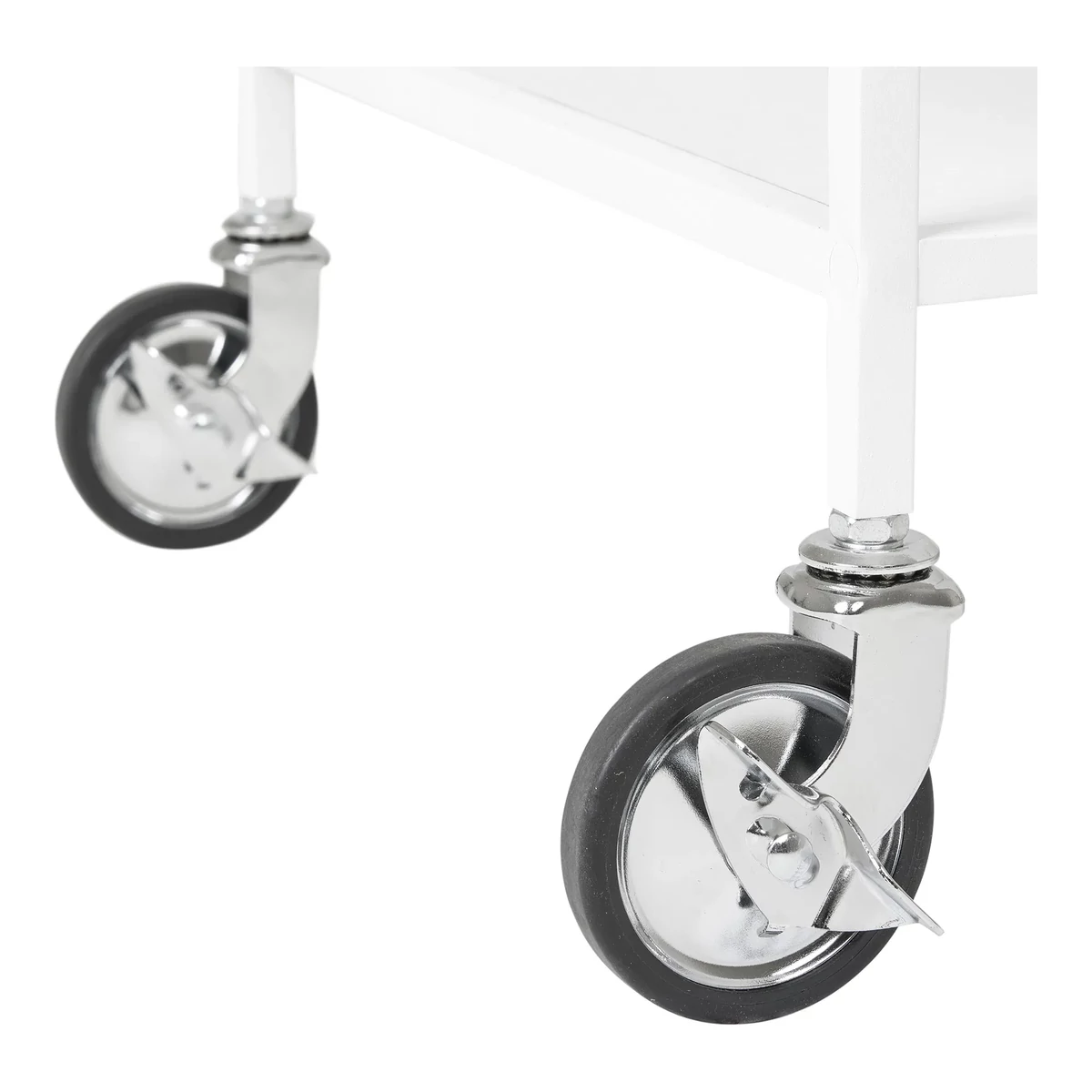 Fehér polcos bárkocsi, amely nem csak praktikus kiegészítő megoldás, de nagyon stílusos is. Különösen jól jön, ha vendégek érkeznek és a tálalás egy másik helységben történik, vagy ha a konyhában nincs elég tároló kapacitás. A bárkocsi 2 polccal rendelkezik, fém keret veszi körbe, így biztos semmi nem fog leesni róla. Kerekei nagyok, de nem otrombák, a közlekedést megkönnyítik. Mérete 68x40x79 cm. Gyártó: House Nordic