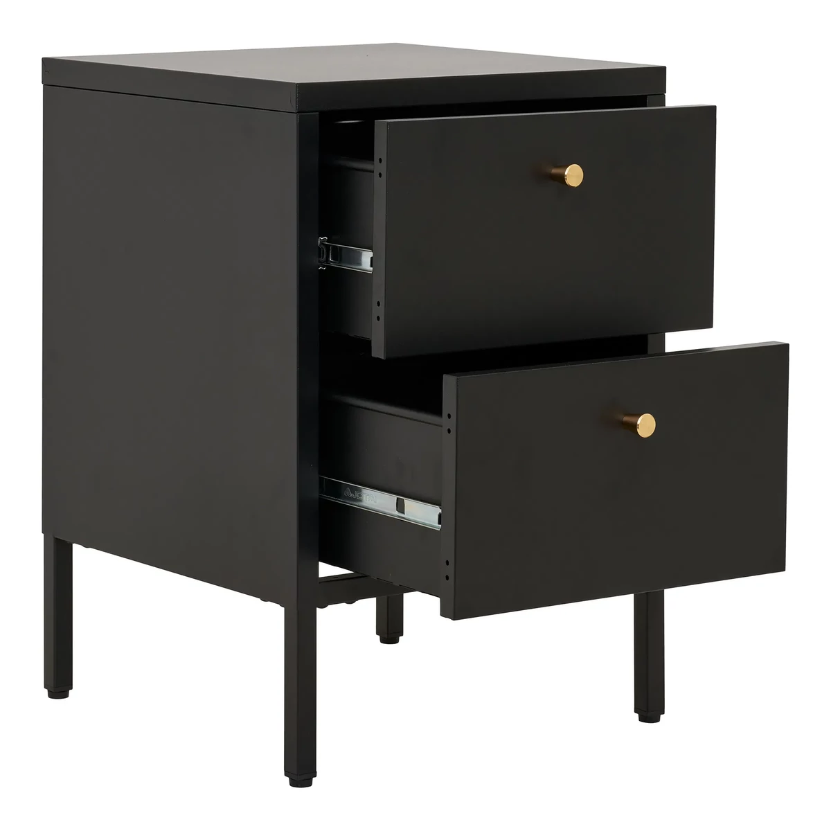 Fekete 2 fiókos fém éjjeliszekrény, amely praktikus tárolási megoldást kínál modern otthonok számára. Sárgaréz színű fogantyúja extra csillogást kölcsönöz a fém éjjeliszekrénynek. Mérete: 40 × 40 × 60 cm. Gyártó: House Nordic.