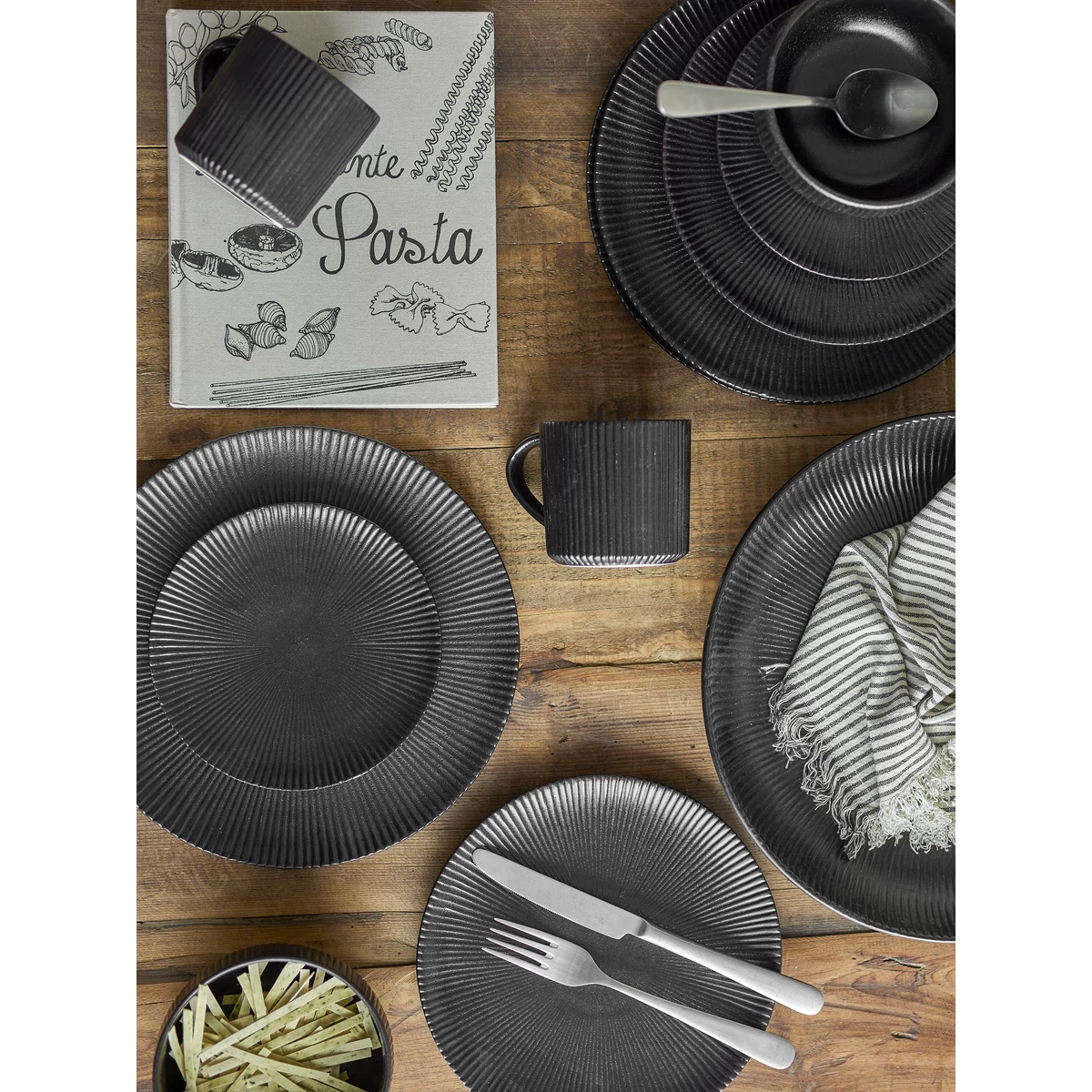 Fekete kerámia 4 személyes étkészlet, amely 4 db nagy lapostányért, 4 db kisebb lapostányért és 4 db tálat tartalmaz. Az étkészlet 100% kerámia, fekete színben. A tányérok redőzött felszíne és szikrázó fekete színe az asztalt ünnepivé varázsolja. A fekete mázban lehetnek fém részecskék, ezért mikróban nem használható. Mosogatógépben mosható. A tányérok átmérője 17, 23 és 29,5 cm. Gyártó: Bloomingville