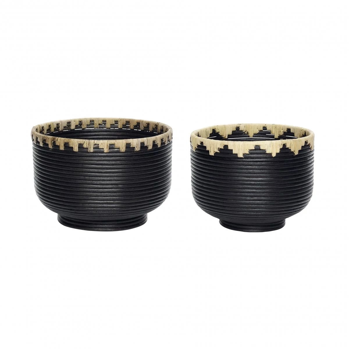 Fekete színű, rattan kerek kosár 2db-os szettben, amely két különböző méretű darabból áll. A kosarak fekete színükkel és natúr szegélyükkel könnyedén beillesztkedő részei lesznek a lakás bármely szobájának. A kosarak kialakítása azt a hatást kelti, mintha fonalból vagy kötélből készült volna, mely körkörösen lett tekerve rajta, a felső szegélyen pedig natúr színű díszítést kapott és ez teszi igazán különlegessé ezt a szettet. A lakás több részén elhelyezve is egységet alkotnak, így kiválóan használhatók akár többféle tároló megoldásként is, így akár cserepes növényeink kihangsúlyozására. A kosár szett méretei: Ø25x19 cm és Ø30x20 cm. Gyártó: Hübsch