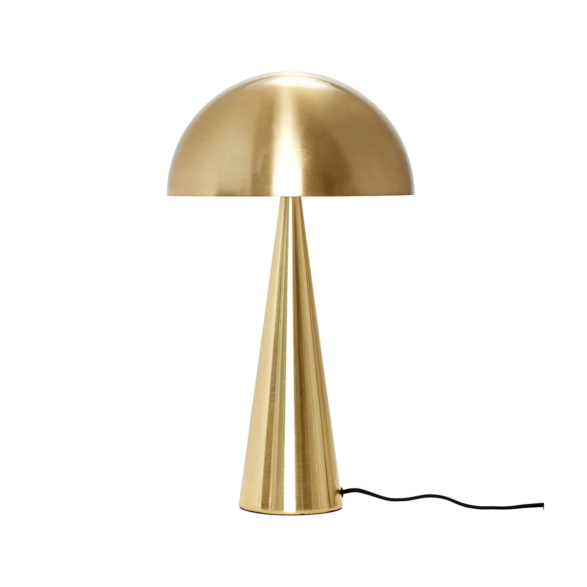 Gomba alakú sárgaréz asztali lámpa, amely csillogó arany színével és modern, gombára hasonlító formájával azonnal felhívja magára a figyelmet. Ez az asztali lámpa stílusos kiegészítője lesz akár a nappalinak vagy a hálószobának. A lámpa búrájának átmérője 30 cm, a magassága 50 cm. A vezeték fekete, textil. Gyártó: Hübsch