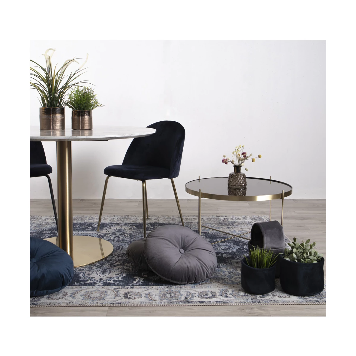 Modern kerek réz kisasztal, amely hamar nappalid kedvenc alaptartozékává fog válni. Kerek üveglapot réz színű acél keret öleli körbe, karcsú lábakon áll keresztező rudakkal, igazán figyelemfelkeltő darab. A sötét üveglap és a viágos lábak színe finom kis kontrasztot képez. Remekül mutat a kisebb kiadásával, de önmagában is szemet gyönyörködtető kiegészítő. Mérete: 70x70x40 cm. Gyártó: House Nordic