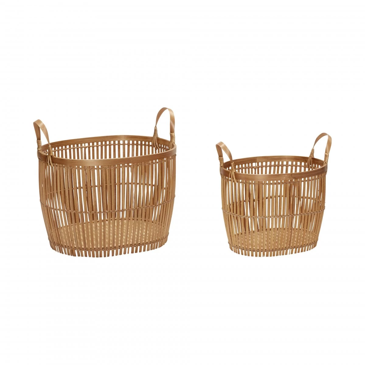 Natúr színű, füles bambusz kosár 2db-os szettben, amely két különböző méretű darabból áll. A kosarak natúr színeikkel könnyedén beillesztkedő részei lesznek a lakás bármely szobájának. Otthonunk távolabbi szobáiban elhelyezve is egységet alkotnak, így kiválóan használhatók akár többféle tároló megoldásként is, akár a nappaliban, az étkezőben vagy a hálószobában is. Kialakításának köszönhetően akár virágcserepet is biztonsággal elhelyezhetünk benne. A kosár szett méretei: 37x36x29 cm és 38x47x33 cm. Gyártó: Hübsch