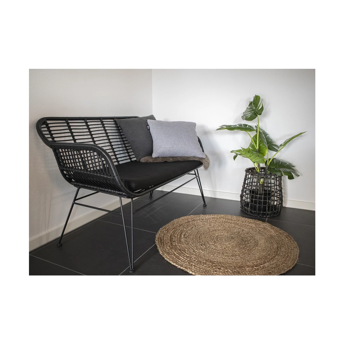 Fekete mintás kör juta szőnyeg. Természetes juta anyagból, a szoba vagy terasz ideális kiegészítője. Átmérője 120 cm