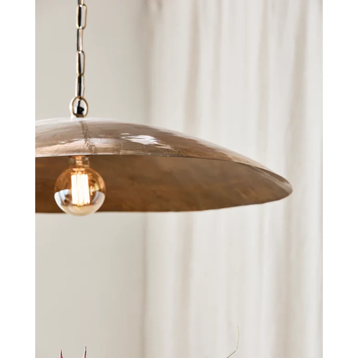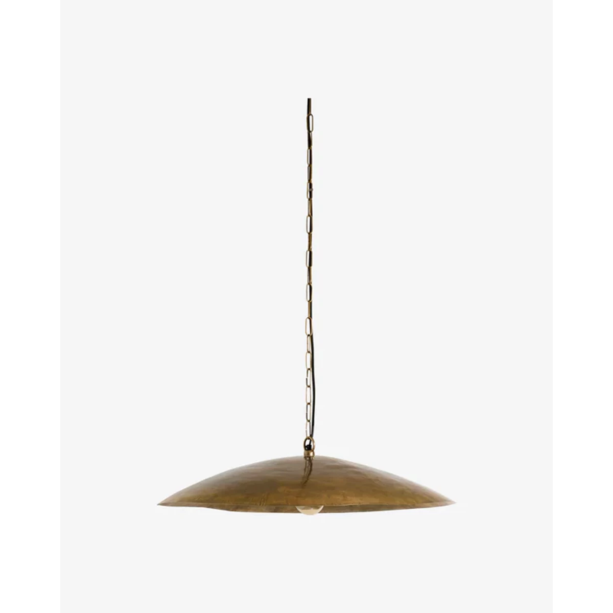 Nordic egyedi sárgaréz függőlámpa, amely egy igazán különleges és extravagáns darab. A függőlámpa lapos tányérja organikusan szabálytalan, így teremt egyedi hangulatot az enteriőrben. A sárgaréz búra alól kilátszódó izzó és a függesztéshez tartozó lánc az indusztiális stílust hangsúlyozza. Vezetéke 125 cm hosszú. Tedd egyedivé és elegánssá az otthonod ezzel a kézzel készült különleges függőlámpával! A lámpa súlya 4 kg. A lámpa mérete 70x79 cm. Gyártó: Nordal