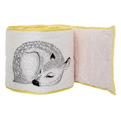 Vidám színekben pompázó pamut gyerekágy rácsvédő állatos mintával. Rendkívül dekoratív, bármely babaszobát feldobja. A rácsvédőn különböző erdei alvó állatok láthatók. A rácsvédőt könnyű feltenni, vastag és puha úgy védi a babát a kiságyban, mint egy bélelt fészek. Anyaga 100% pamut. Mérete 340x31x3 cm. Gyártó: Bloomingville
