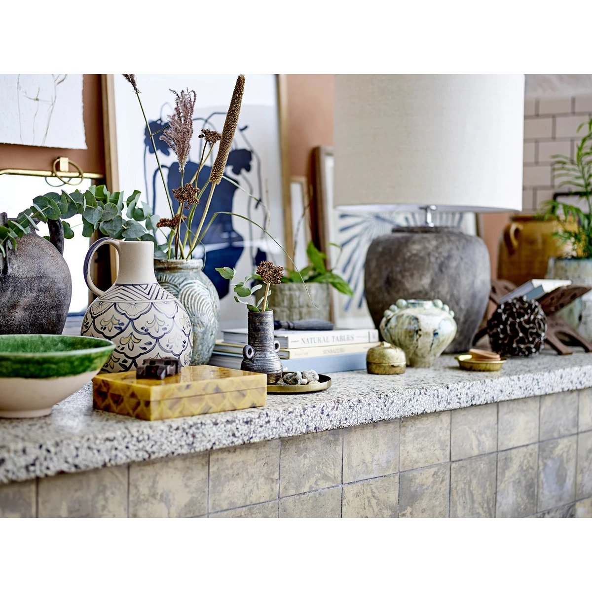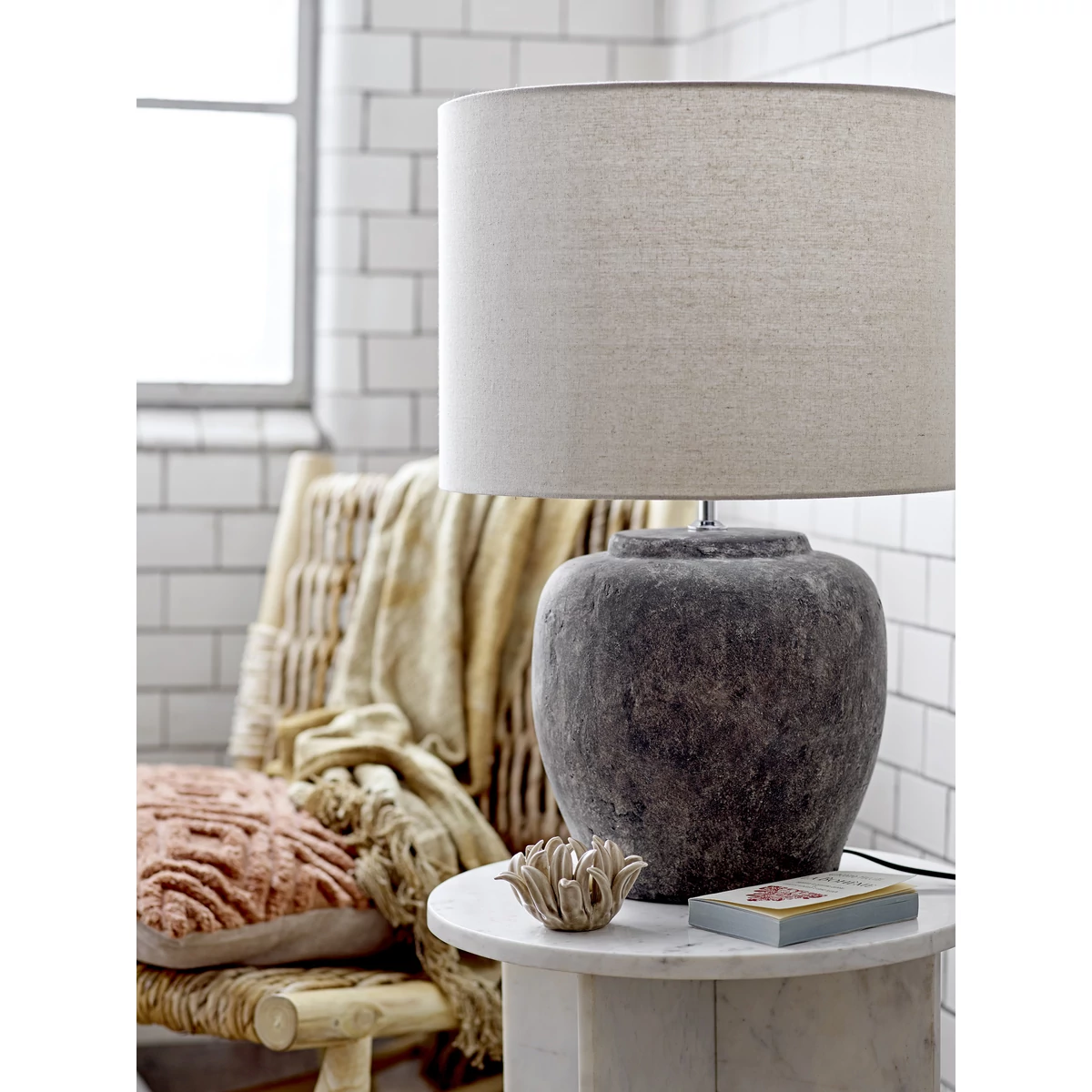 Rusztikus kő és lenvászon asztali lámpa, amely feltűnő kiegészítője lesz akár a nappalinak vagy a hálószobának. Az asztali lámpa természetes kő lámpatestől és fehér lenvászon búrából áll, ezzel ad rusztikus vintage hangulatot a helységnek. A lámpa kapcsolója a vezetéken helyezkedik el. A lámpa magassága 62 cm, vezetéke fekete, műanyag, hossza 150 cm. Gyártó: Bloomingville