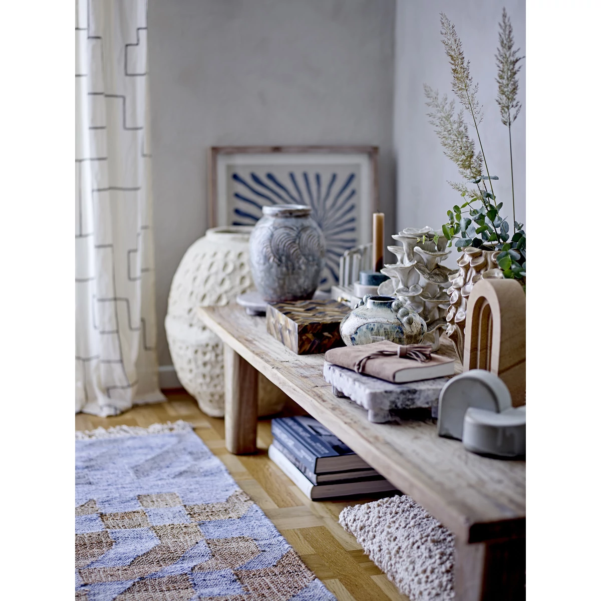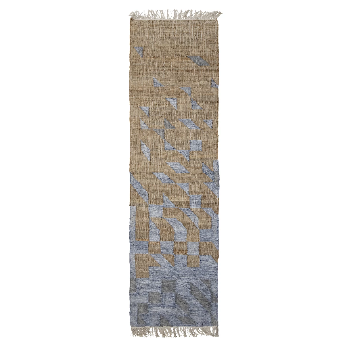 Skandináv, kék mintás szőnyeg, amely absztrakt mintás, kék és natúr színű, skandináv stílusú szőnyeg, mindkét szélén rojtokkal. A szőnyeg natúr színe jól illeszkedik a fa bútorokhoz, elsősorban a természetes és rusztikus stílusú enteriőrben. Ajánljuk a nappali szobába vagy előszobába. Mérete 245x75 cm. Gyártó: Bloomingville