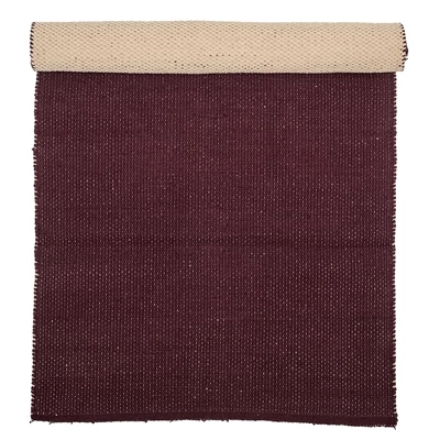 Sötétbordó pamut szőnyeg, amely feldobja a hidegebb téli napokat is, és melegséget visz otthonodba. Színének és dekoratív kialakításának köszönhetően tökéletes hálószobába vagy akár előszobába is. A szőnyeg anyaga 97% pamut, 3% egyéb anyagok, mérete 120x60cm. Gyártó: Bloomingville