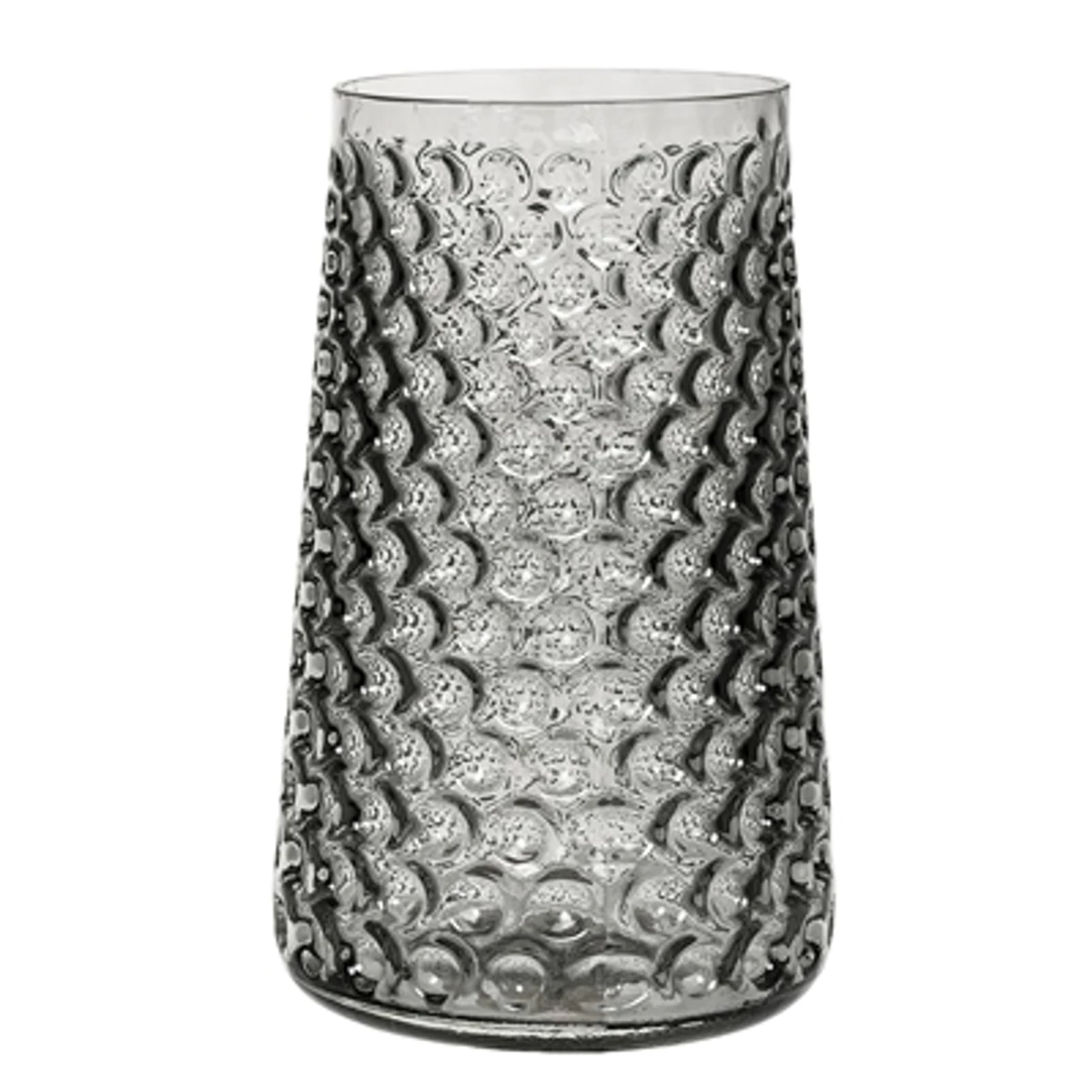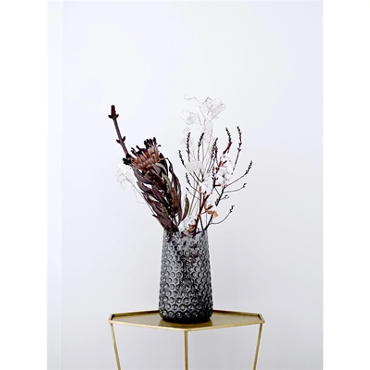 Szürke üveg váza amely szájjal fúvott technikával készült és így minden darab különböző és egyedi. Ez a gyönyörű magas váza kiválóan alkalmas hosszú szárú virágokhoz, az átlátszó üveg megmutatja a virágok leveleit, szárát is. Éredmes színes virágokat helyezni bele, amelyek ellensúlyozzák a váza szürke színét. A váza átmérője 18,5 cm, a magassága 30,5 cm. Gyártó: Bloomingville