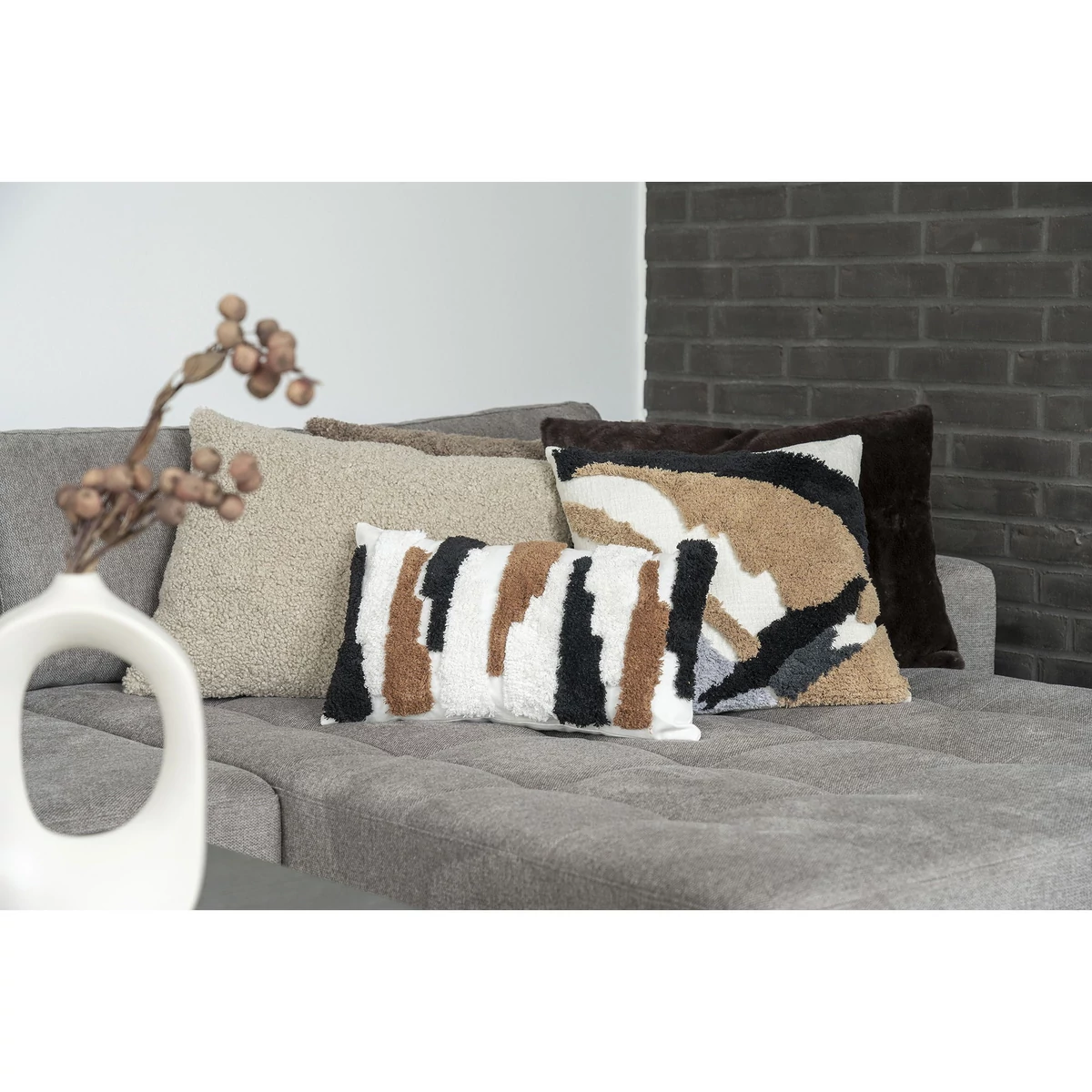 2 db Szürkésbarna buklé díszpárna 45x60 cm. Puha és stílusos kiegészítő a kanapén. Töltettel együtt érkezik.