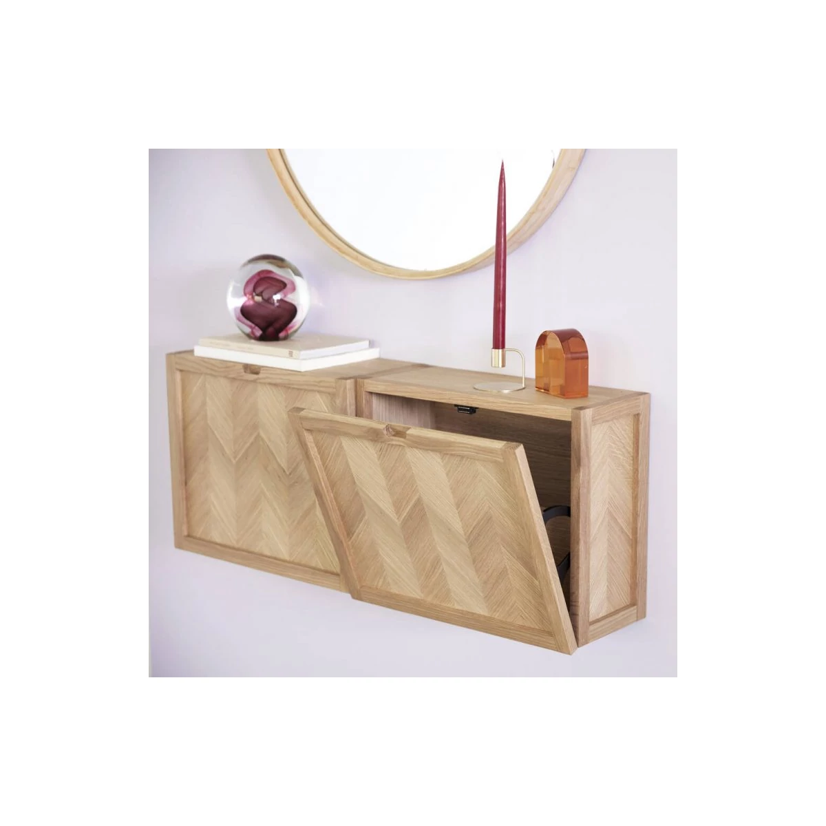 Tölgyfa cipőtároló, amely minőségi kivitelezésének köszönhetően az előszoba ékkövévé válhat. Praktikusan használható, hiszen a falraszerelhető, így cipőtartó funkciója mellett, egy plusz pakolófelületet is nyújt. A cipőtartó kerete tömör tölgyfából készült, amit egy igényesen kidolgozott tölgyfa furnéllemez díszit. Gyártó: Hübsch