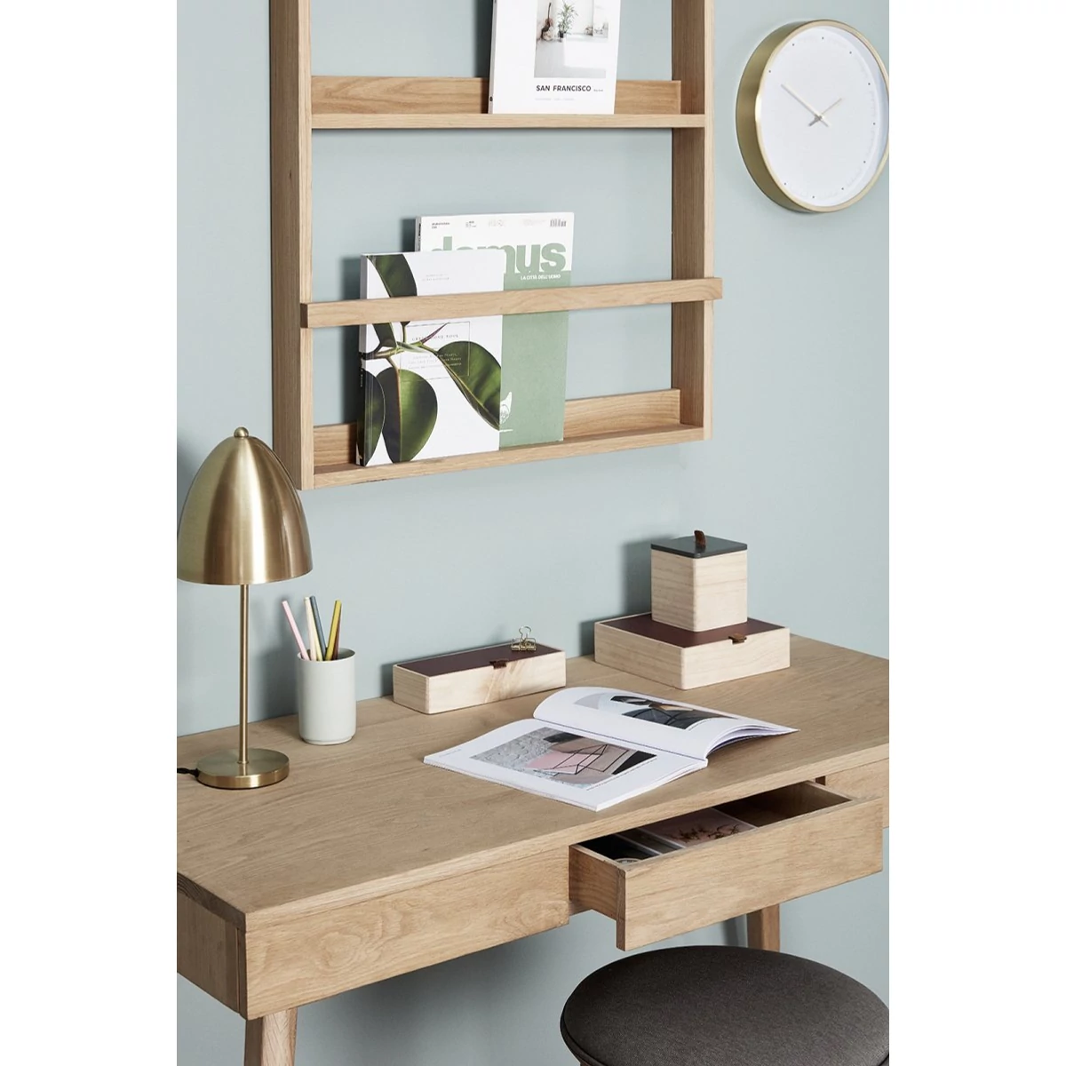 Tölgyfa, keskeny fali polc, amely magas minőségű és kivitelezésű igazi minimalista darab. A polc 2 tartólapból és 2 lécből áll, melyek megtartják a tartóra helyezett magazinokat, könyveket. Ajánljuk íróasztal fölé, ahol a keskeny polc nem fog sok helyet elvenni és az asztal fölé benyúlni. A polc anyaga tömör tölgyfa, hossza 92 cm, szélessége 70 cm, mélysége 9 cm. Gyártó: Hübsch