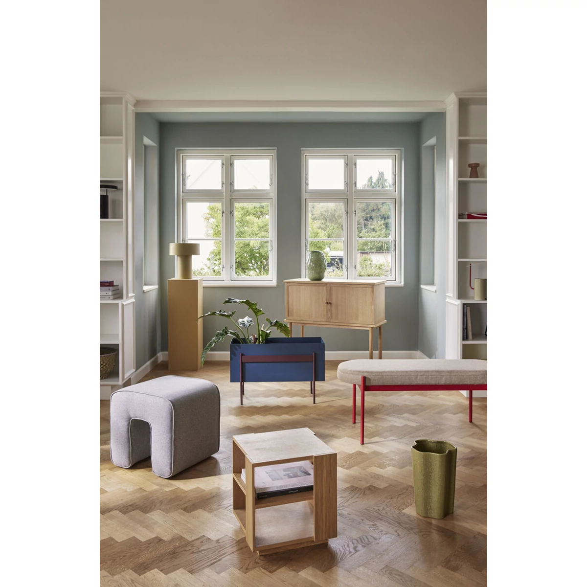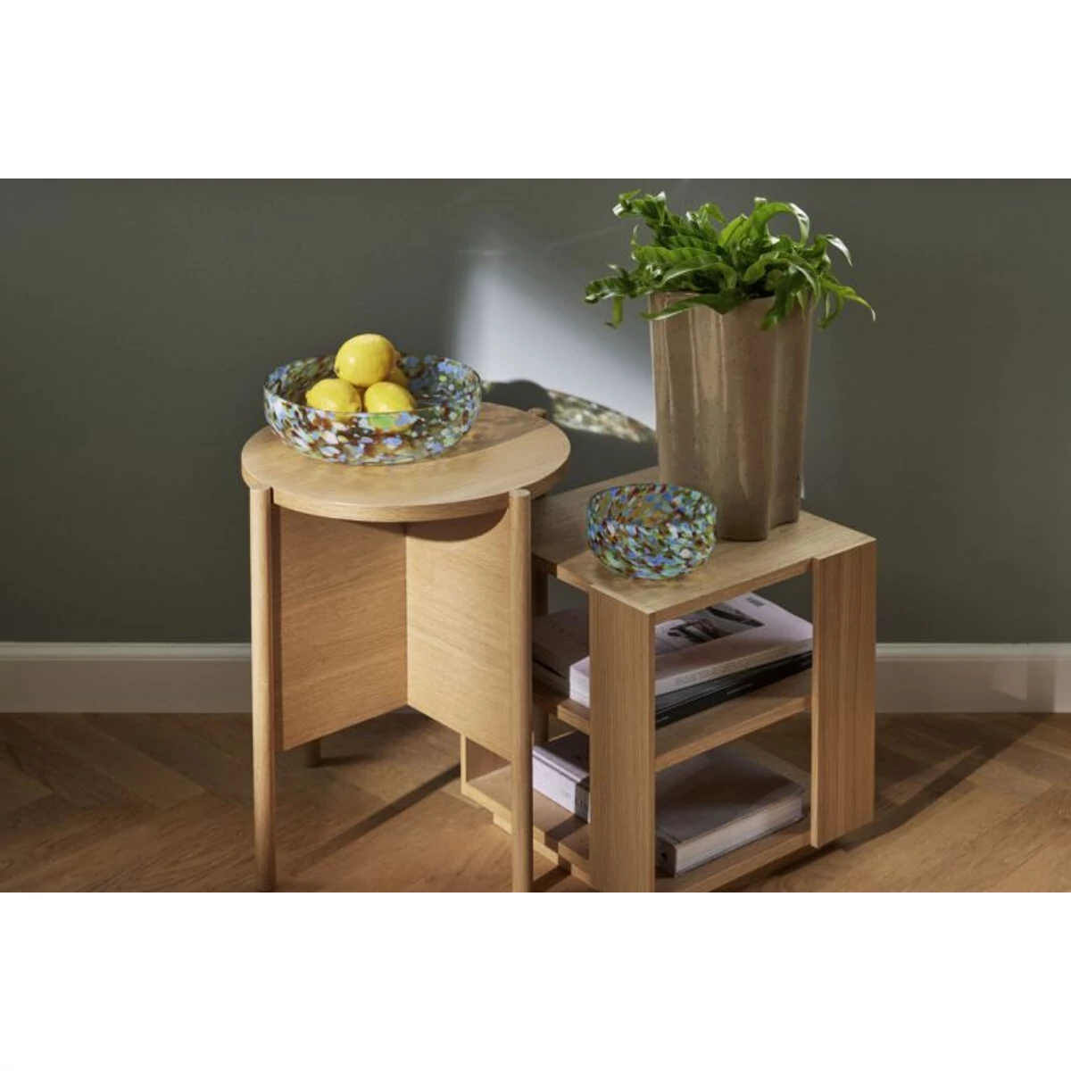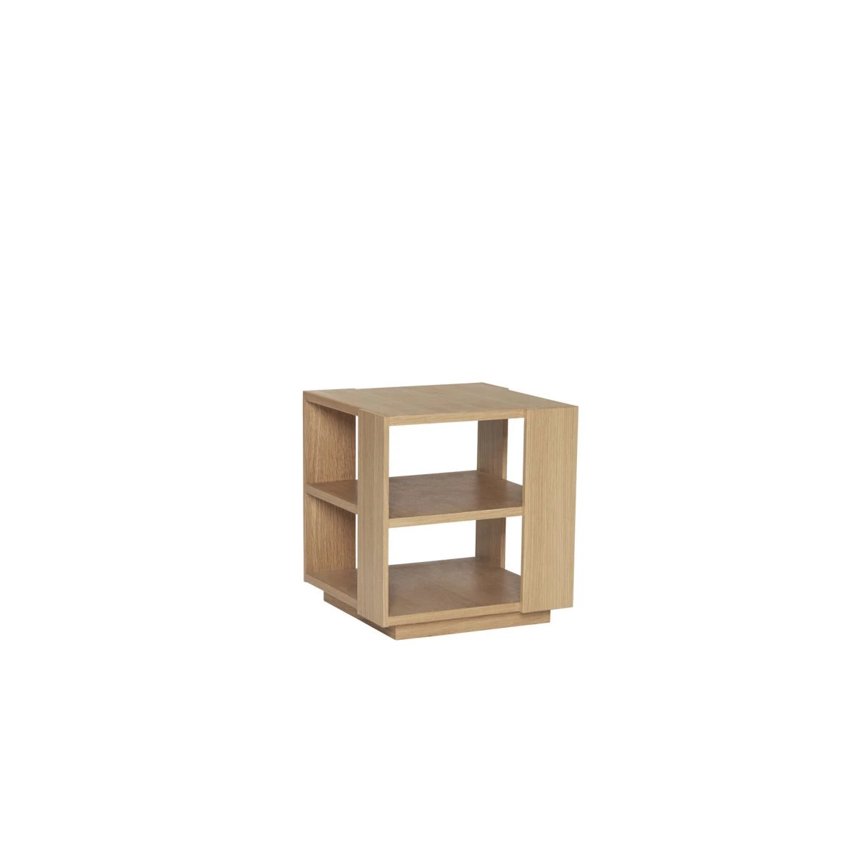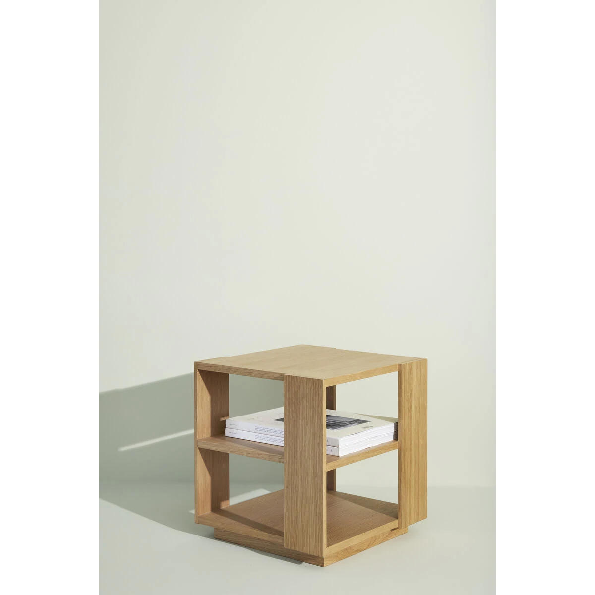 Tölgyfa polcos kisasztal, amely a '60-as évek világát idézi de újragondolt, modernebb verzióban. A kisasztal tölgyfa furnérból készült, alsó lerakó polcán jól elférnek a magazinok, újságok vagy könyvek. Így mindig kéznél lesz a nappaliban vagy a hálószobában az olvasnivalónk. A kisasztal hosszúsága 37 cm, szélessége 37 cm, magassága 48 cm. A polcok teherbírása max. 10 kg. Gyártó: Hübsch