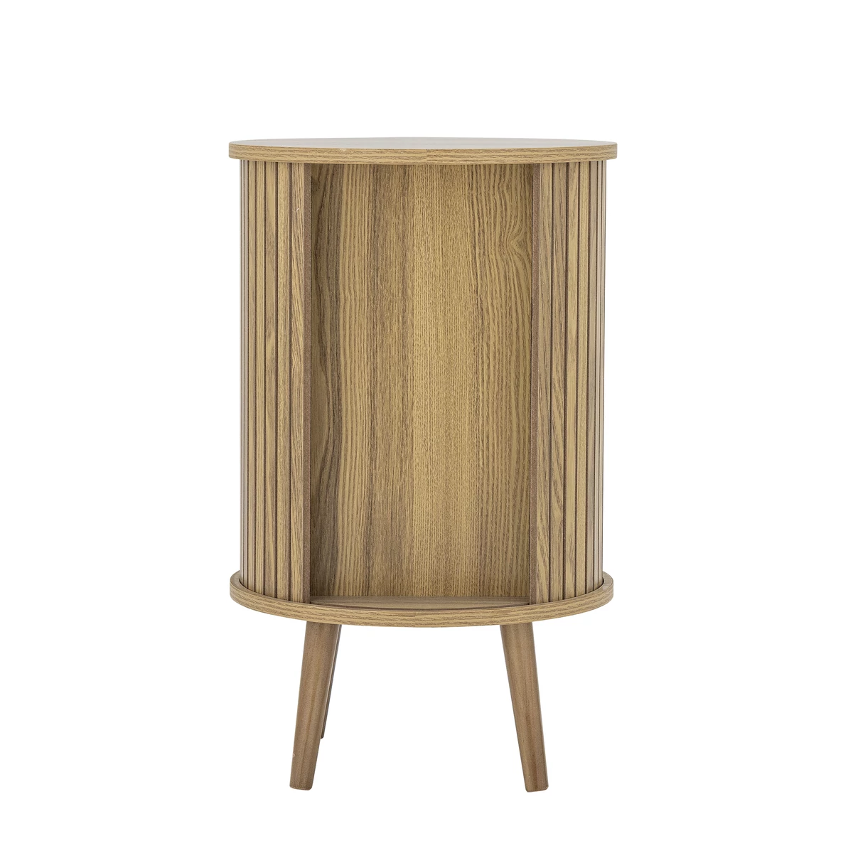 Tolóajtós kerek fa éjjeliszekrény, amely egy igazi skandináv stílusú kiegészítő bútor a hálószobában vagy a nappaliban. Az éjjeliszekrény bordázott ajtaja modern és nagyon trendi megjelenést kölcsönöz neki. Anyaga natúr színű fenyőfa, amely jól illeszkedik a hálószoba más nagybútoraihoz. Magassága 65 cm. Gyártó: Bloomingville
