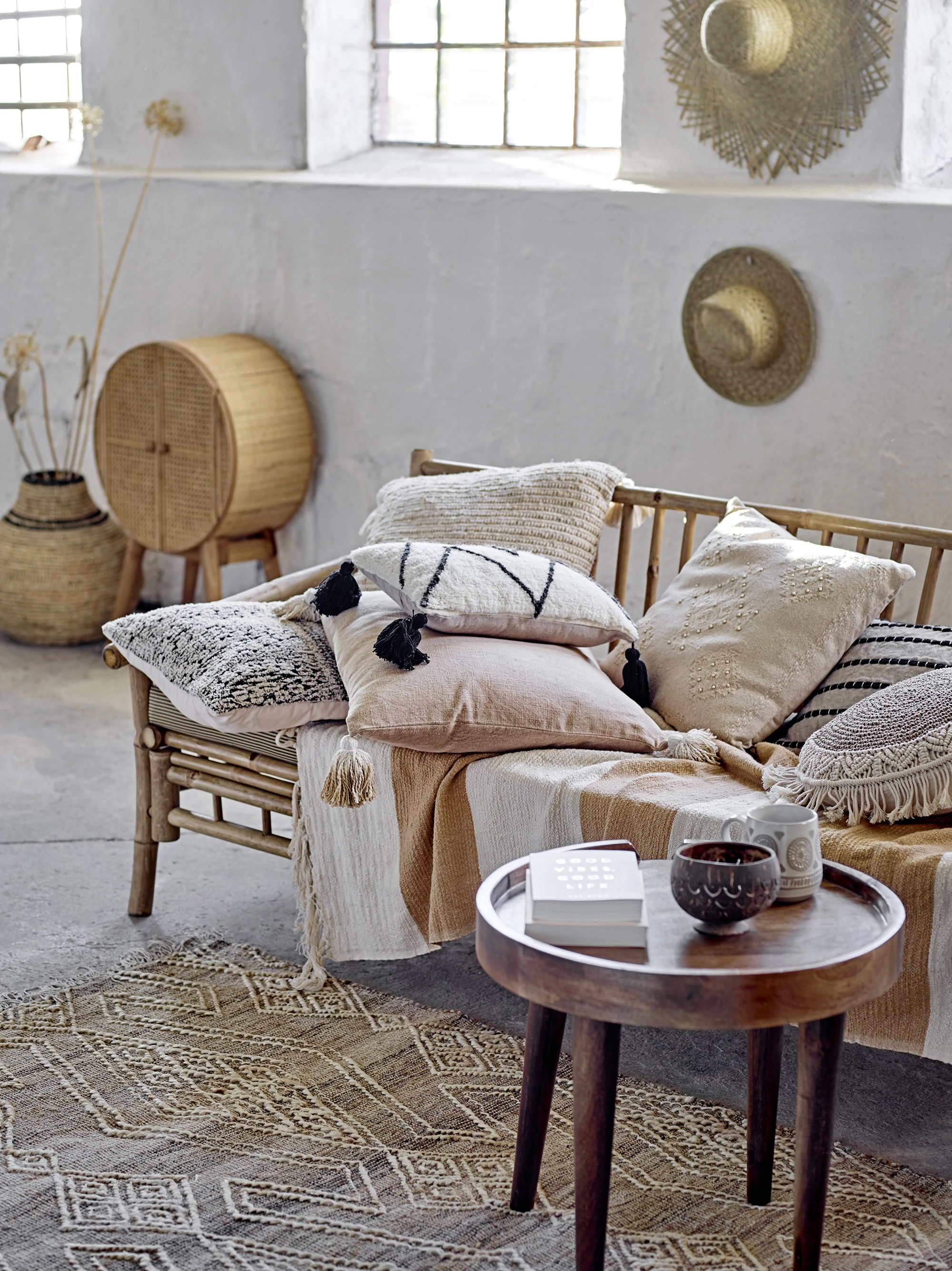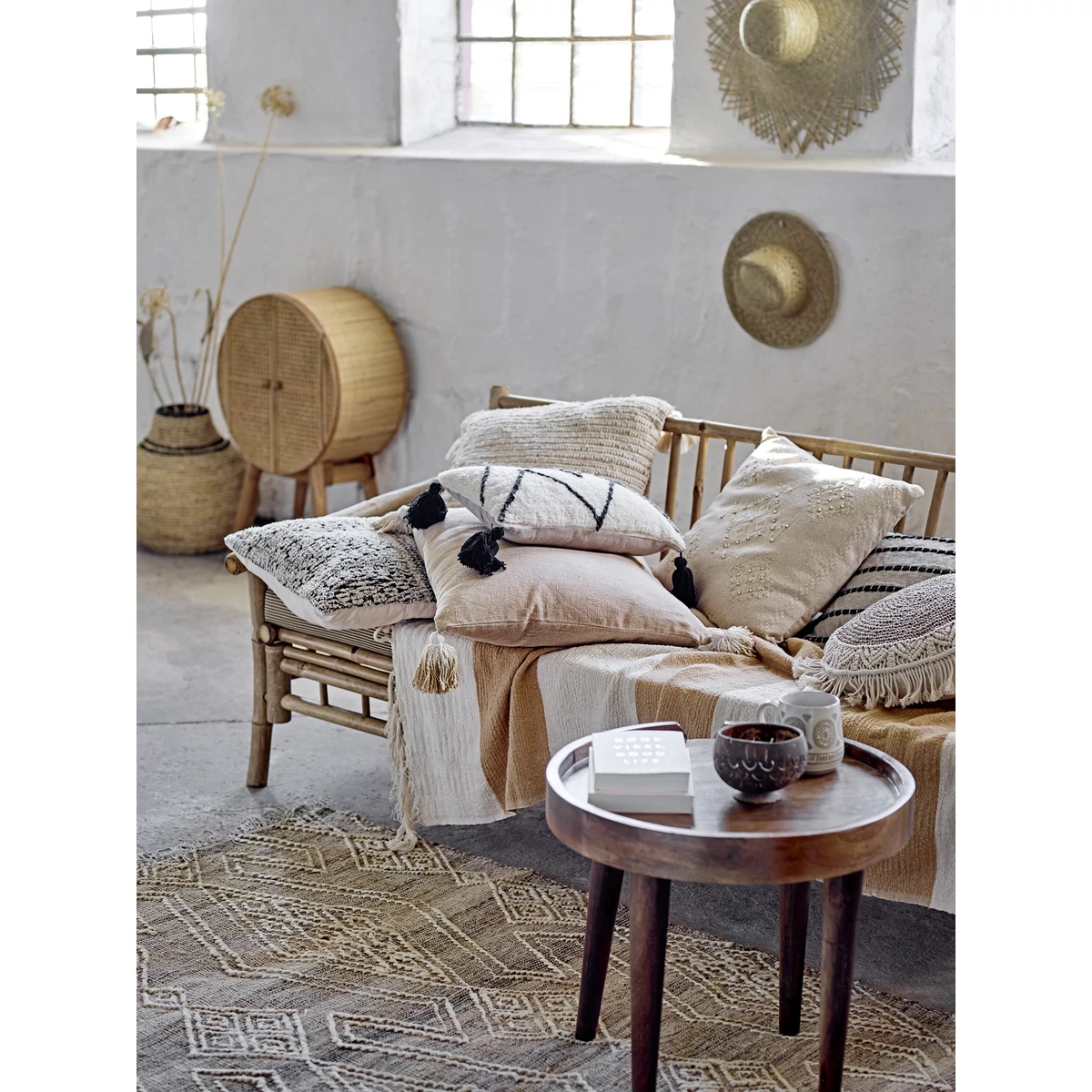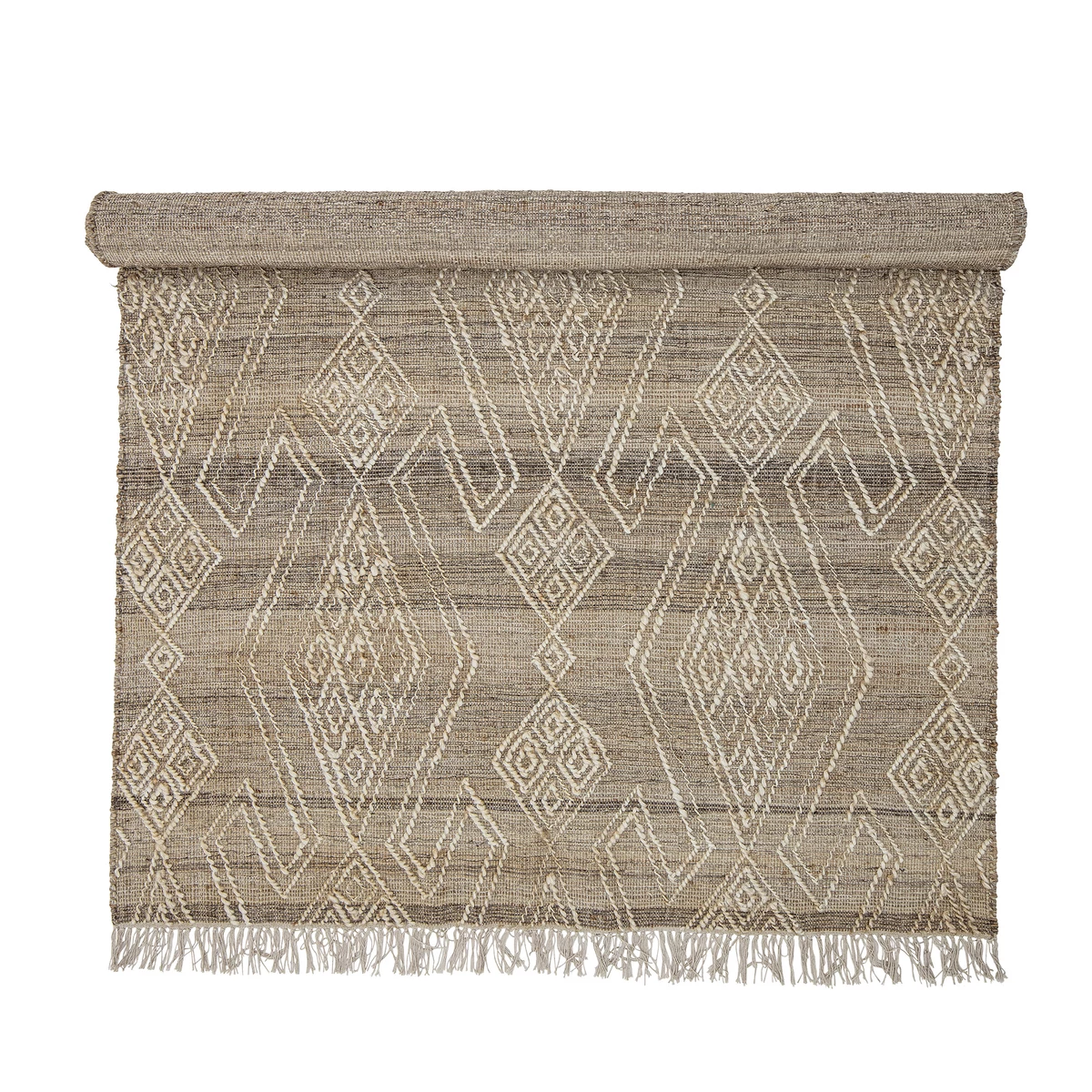 Világos absztrakt mintás szőtt juta szőnyeg, amely juta és gyapjú anyagból készült, gyönyörű minőségi skandináv stílusú szőnyeg az otthonodban. Használd a nappaliban vagy a hálószobában, mindenhol barátságos hangulatot teremt. Mérete: 215x150 cm. Gyártó: Bloomingville
