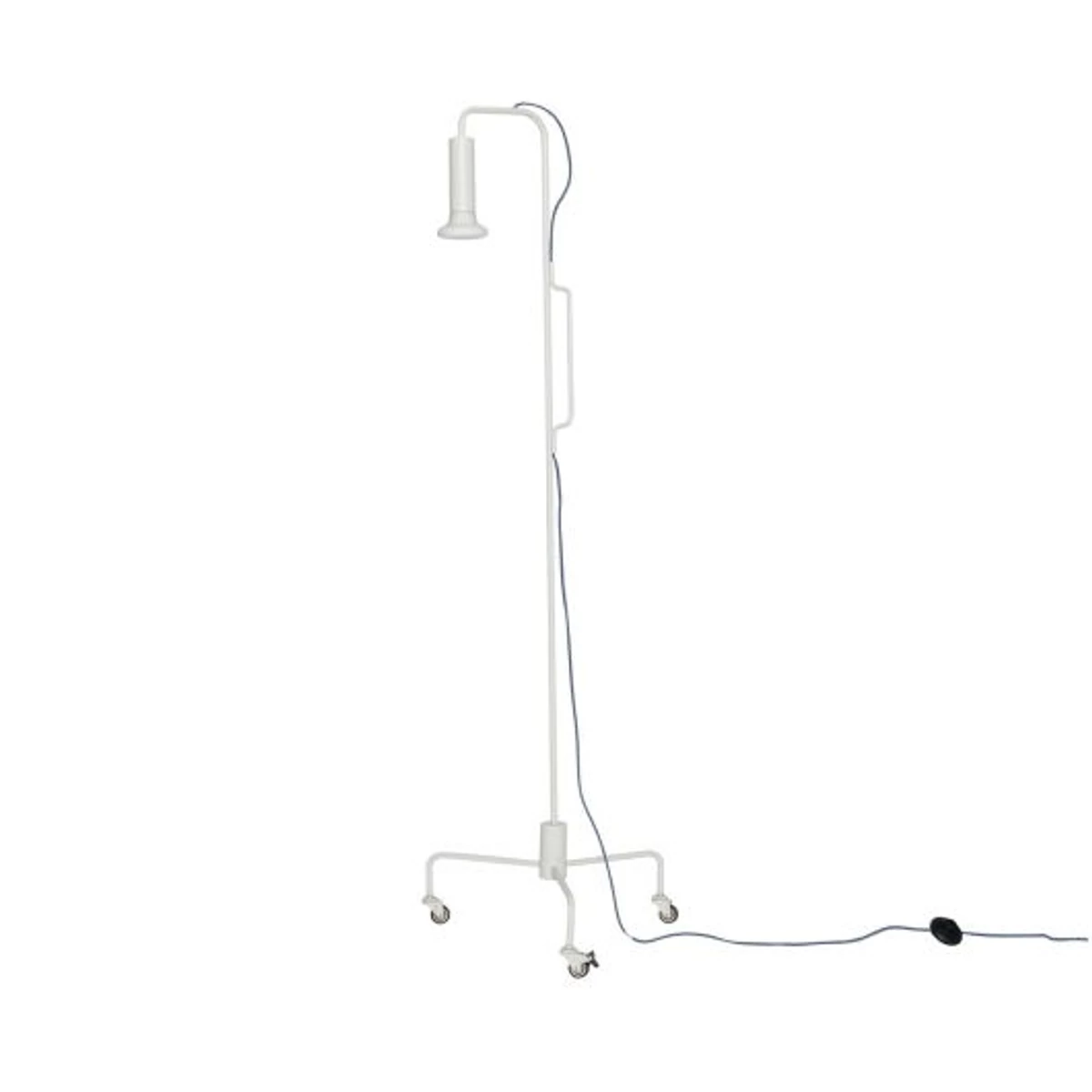 Világosszürke görgős állólámpa, amely világosszürke színű fém vázból áll és görgők segítségével könnyen mozgatható. Az állólámpa modern stílusát a kék színű textil vezeték hangsúlyozza. Az állólámpán található fogó kialakítása még könnyebbé teszi a lámpa mozgatását. Ajánljuk irodába, dolgozószobába, tanuláshoz vagy éppen a nappaliba olvasáshoz. A lámpa magassága 154 cm, a vezeték hossza 200 cm, kék textil borítású. Gyártó: Hübsch