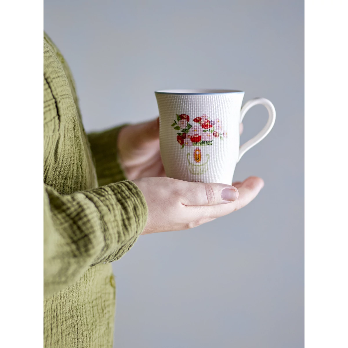 Virág mintás kék kerámia bögre szett, amely nagyon szép kézzel festett virág motívumokat ábrázol és a romantikát csempészi a hétköznapokba. A bögrék felülete a hímzéshez hasonló, apró négyzethálós ettől a bögrék még különlegesebbek. A bögrék két oldalán két különböző virágminta látható, a széle pedig világoskékre van festve. A bögrék egyedileg készültek, ezért apró eltérések lehetnek. Mérete 9x10 cm, 310 ml. Gyártó: Bloomingville