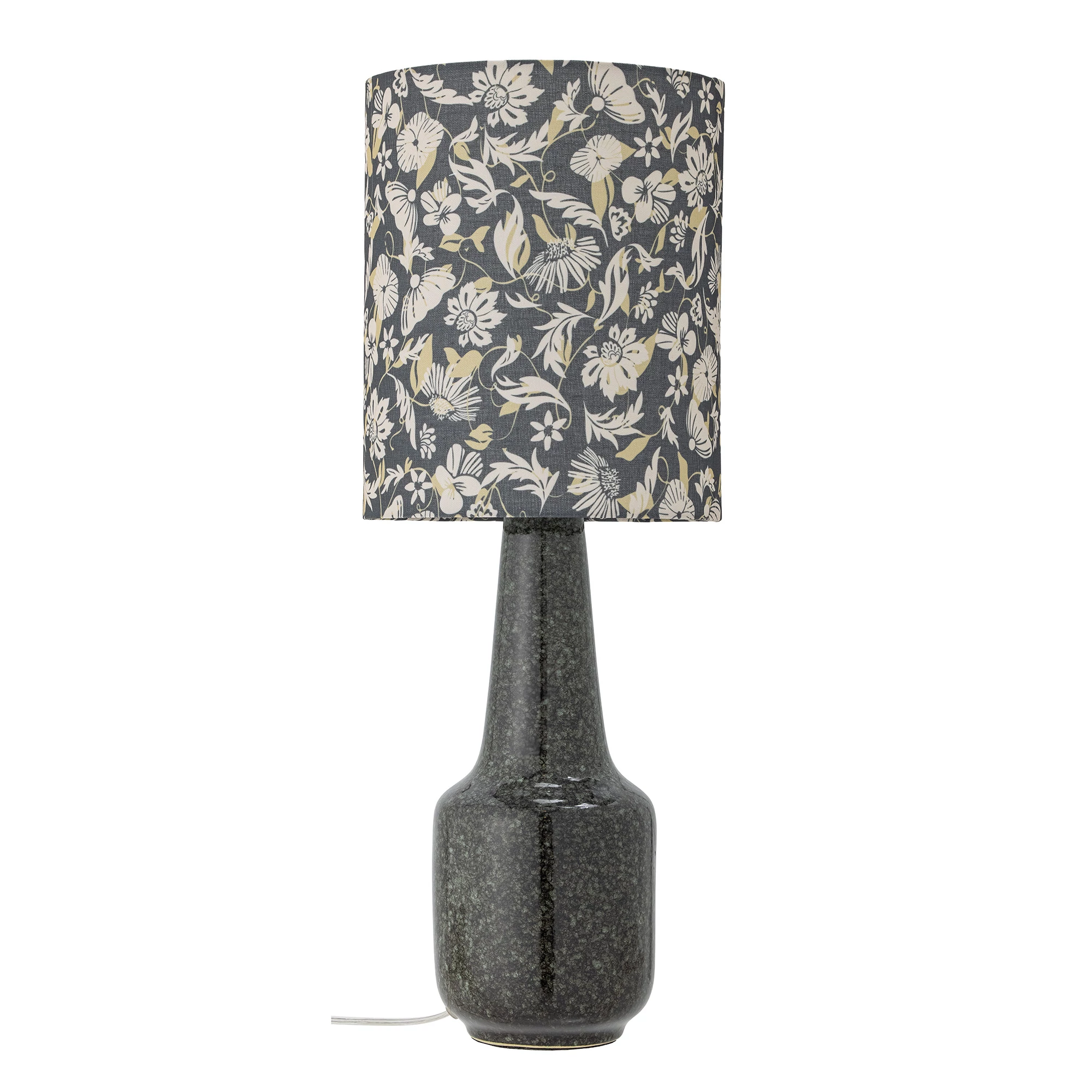 Zöld kerámia lámpa virágos ernyővel, amelynek sötétzöld lámpateste kézzel mázolt kerámából áll. A lámpaernyő színben hozzáillő zöld és virágos textil. Ajánljuk hangulatvilágításnak vagy olvasólámpának a nappaliba. A lámpa vezetéke átlátszó műanyag, hossza 250 cm. A lámpa magassága 62 cm, átmérője 23 cm. Gyártó: Bloomingville